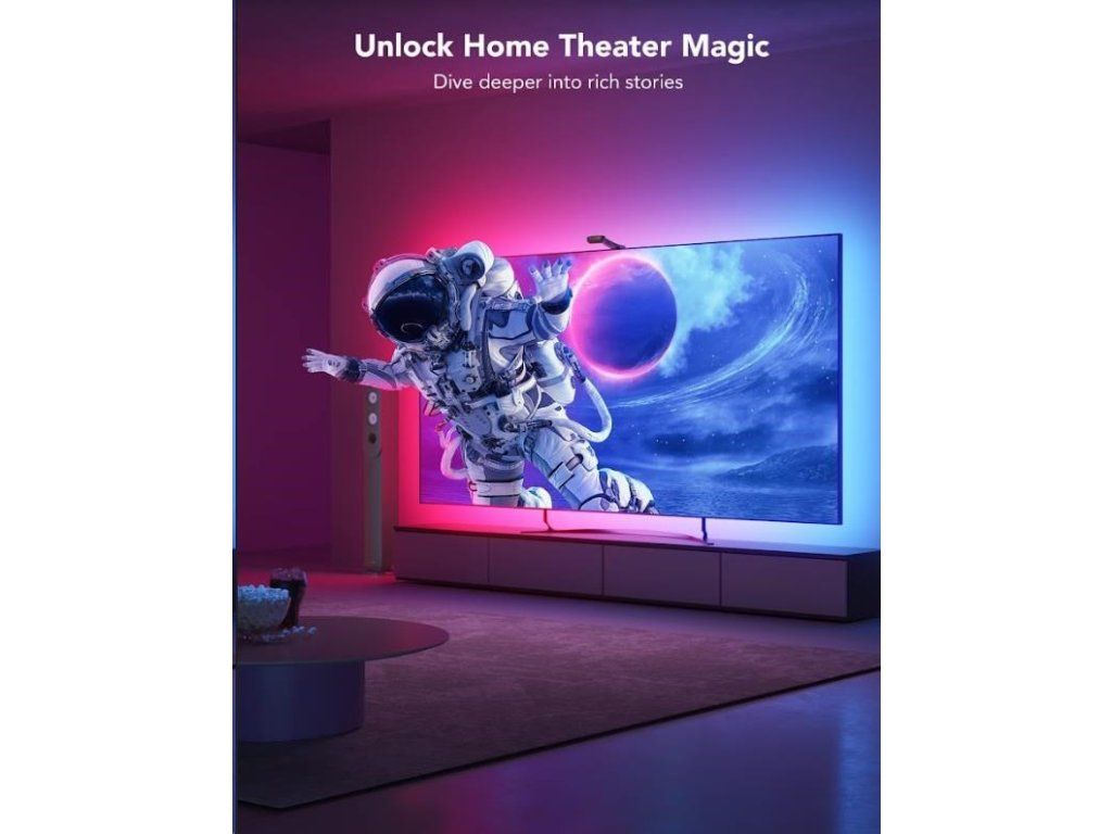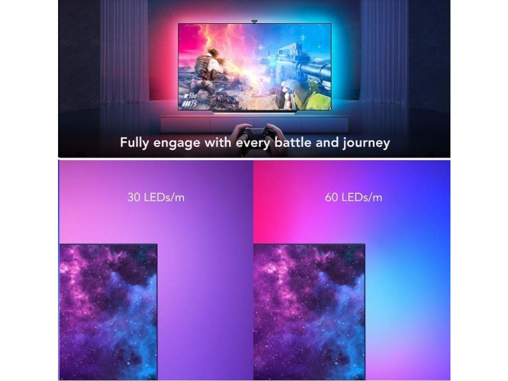 LED pásky sa inštalujú na zadnú stranu TV o veľkosti 55-65 palcov. Je možné ich rozdeliť na viac farebných častí a kombinovať ich farebné prevedenia. Objavte vysokú úroveň zážitku pri sledovaní filmov alebo hraní hier s dynamickými farbami vyžarujúcimi zo všetkých kútov vašej obrazovky (nie je optimalizované pre zakrivené televízory). Vo výbave sa nachádzajú 4 prepojené pásy, ktoré sa inštalujú na zadnú stranu TV alebo monitora.