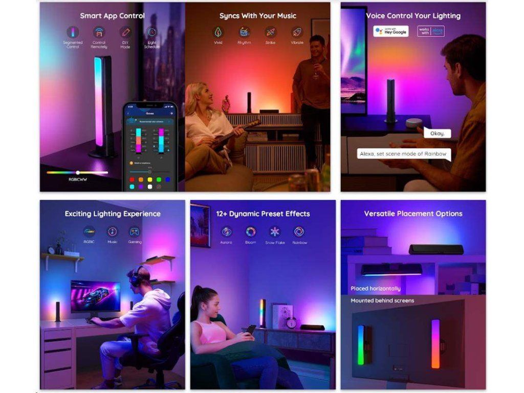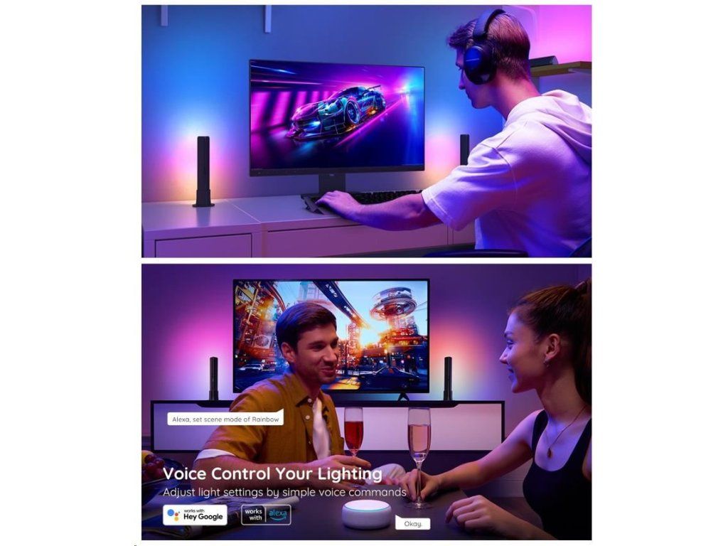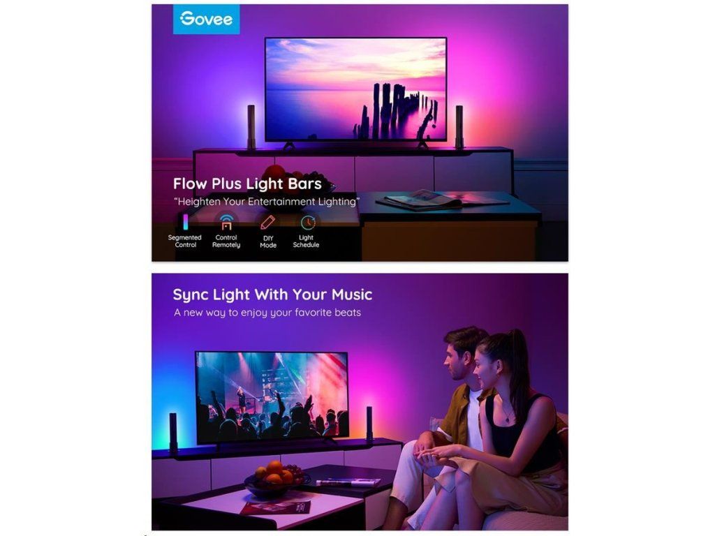 Vylepšite svoje herné, filmové a hudobné zážitky pomocou živého inteligentného osvetlenia Govee Flow Plus. 16 miliónov farieb s 12 režimami, vrátane 4 režimov na synchronizáciu s hudbou, posúva zážitok zo sledovania televízie alebo hrania hier na novú úroveň. Ovládajú sa hlasom cez Siri, Amazon Alexa alebo Google Assistant, cez aplikáciu alebo cez Control box. Preto nebudete musieť ani vstávať z gauča. Vďaka univerzálnym držiakom ich môžete kreatívne využívať a prispôsobovať svojim potrebám na televízore alebo na otvorenom priestranstve. Farebné podsvietenie opticky zväčšuje obraz, šetrí oči a má životnosť až 50 000 hodín.