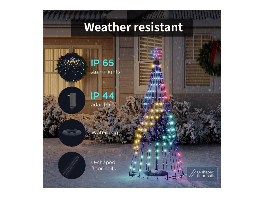 Stromček je odolný voči poveternostným vplyvom a bez problémov zvláda zimné teploty a vlhkosť, takže je ideálnou vonkajšou vianočnou dekoráciou. Vďaka vodotesnej svetelnej reťazi so stupňom krytia IP65 a bezpečnému napájaciemu adaptéru so stupňom krytia IP44 je pripravený odolať dažďu a snehu, zatiaľ čo stabilná konštrukcia s priloženými kolíkmi a závažiami pre základňu zaisťuje pevné uchytenie a stabilitu aj vo veternom počasí.