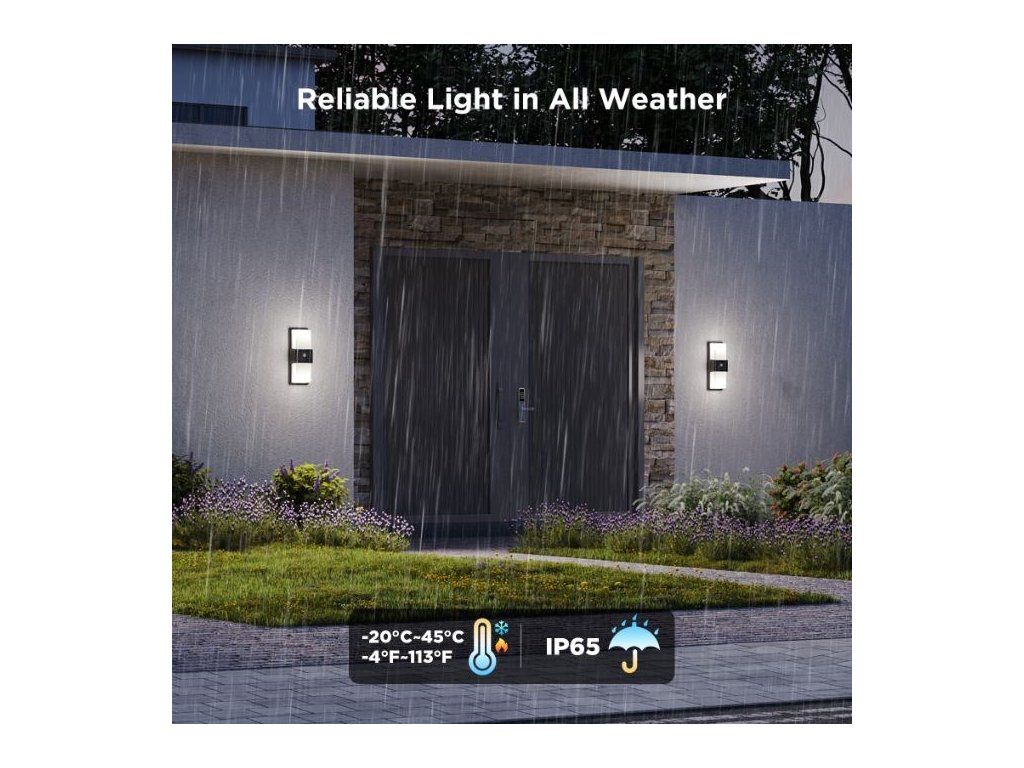 Robustné kovové telo spolu s certifikátom IP65 zaisťujú vysokú odolnosť tohto vonkajšieho nástenného svietidla voči prachu a vode. Svetlo zvládne prevádzku v širokom rozsahu teplôt od -20 do 45 °C, čo znamená stabilný a spoľahlivý výkon aj v náročných vonkajších podmienkach - od mrazivej zimy až po horúce letné popoludnia. Na jeho funkčnosť sa teda môžete spoľahnúť za každého počasia.