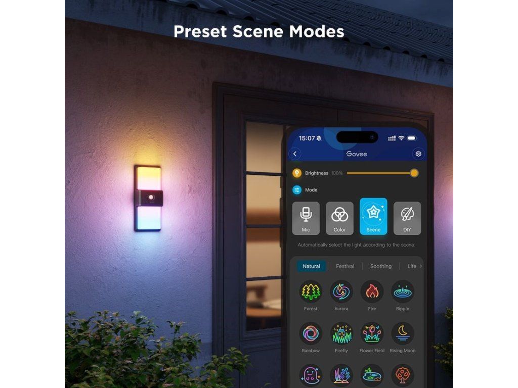 Aplikácia ponúka širokú škálu prednastavených svetelných scén, ktoré môžete ľahko aktivovať podľa nálady alebo príležitosti - od prírodných motívov, ako je „Les“ alebo „Polárna žiara“, až po tematické efekty, ako je ‚Oheň‘ alebo „Dúha“. Navyše funkcia režimu Urob si sám umožňuje vytvárať úplne vlastné svetelné efekty a kombinácie, ktoré plne zodpovedajú vašim predstavám a štýlu. Vďaka tomu sa každá chvíľa vonku premení na osobitý a jedinečný svetelný zážitok.