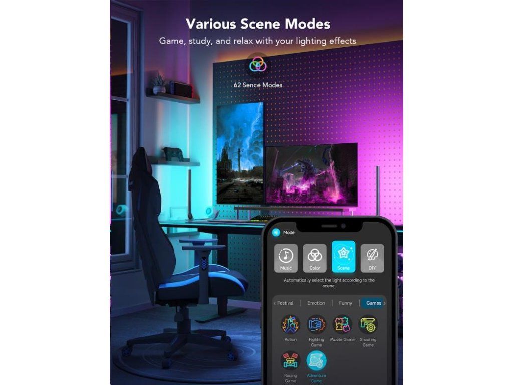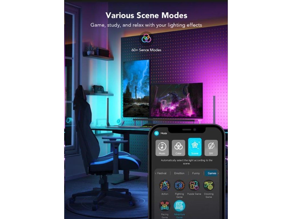 Govee Smart Gaming panely ponúkajú 62 režimov pre dokonalé ladenie svetelnej atmosféry. Govee technológia RGBICWW dokáže zobraziť až 57 farieb naraz z celkovej škály 16 miliónov farieb pri intenzite 1-100%. Môže sa tiež pochváliť živostnosťou až 50 000 hodín.