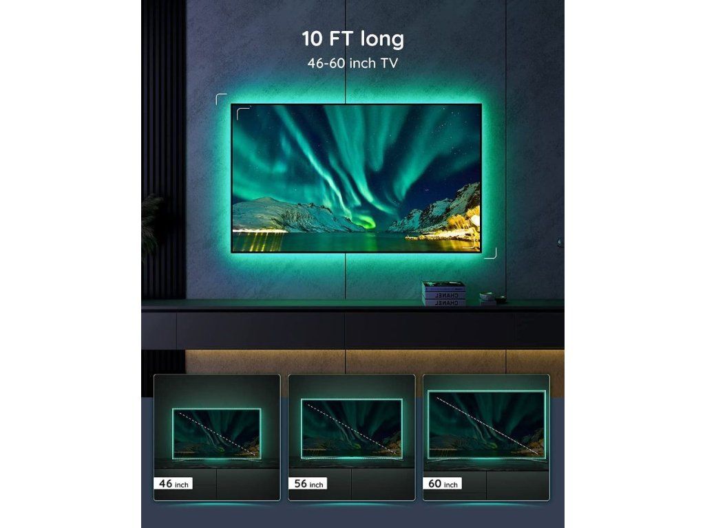 LED pásky sa inštalujú na zadnú stranu TV alebo monitorov o veľkosti 46-60 palcov - nie sú optimalizované pre zakrivené televízory. V balení sa nachádzajú 4 pásky, ktoré sú spojené flex páskami. 2 bočné o dĺžke 0,5m a 2 dlhšie o dĺžke 1m, ktoré sa inštalujú 3M páskami na zadnú stranu TV alebo monitora. Napájanie prebieha cez USB priamo z televízora alebo USB nabíjačku (nie je súčasťou balenia). Pre plný výkon je potrebné napätie 5V/2A.
