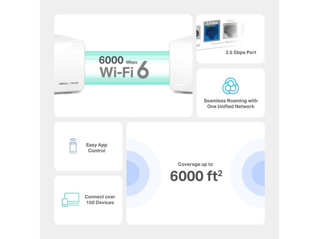 Pokrytie celého domu – prikrývka až 6 000 stôp2 (550 m2) s vysokorýchlostným Wi-Fi, čím sa eliminujú mŕtve zóny WiFi u vás doma.†