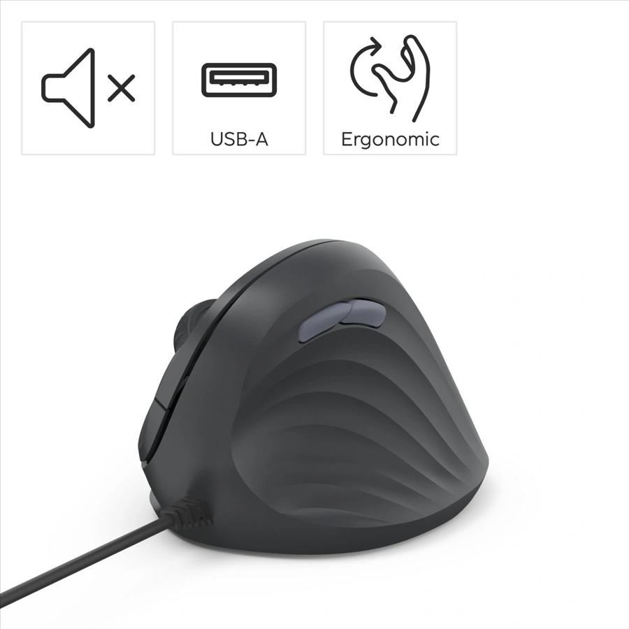 - moderná ergonomická káblová myš pre prácu s počítačom bez bolesti - vertikálne prevedenie predchádza presileniu a bolesti ramien a zápästí - tichá, bez zvukov pri klikaní pre nerušenú prácu - DPI tlačidlo pre zmenu rozlíšenia (1000/1400/1800 DPI) - aktivácia AI asistenta v systéme tlačidlom - tlačidlá s funkciou späť/vpred v prehliadači - pogumovaný povrch myši a kolieska - polymerové kĺzne plochy - dlhý kábel s pripojením k USB-A alebo USB-C zásuvke (integrovaný adaptér) - telo a tlačidlá sú vyrobené z 65% recyklovaného ABS plastu - balenie je 100% bez plastov Systémové požiadavky: - bežné funkcie: Windows 11/10, Mac OS 11 alebo novšie - tlačidlo Assist: Windows 11 s aplikáciou Microsoft Copilot Technické parametre: - pripojenie: USB-A vidlica, USB-C vidlica - počet tlačidiel: 7 vrátane rolovacieho kolieska - rozlíšenie: 1000/1400/1800 DPI - dĺžka kábla: 1,8 m - rozmery: 8,6 x 11,5 x 7,1 cm - hmotnosť: 110 g - farba: čierna