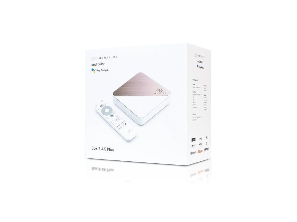 Homatics Box R Plus poteší vynikajúcou výbavou a konektivitou akou je aj Ethernet konektor, 1x USB Type C na zadnom panely slúži pre pripojenie externého tunera, 1x USB Type C na spodnej časti slúži na použitie reproduktora a príslušenstva Homatics, USB 3.0, USB 2.0, S/PDIF optický digitálny audio výstup.