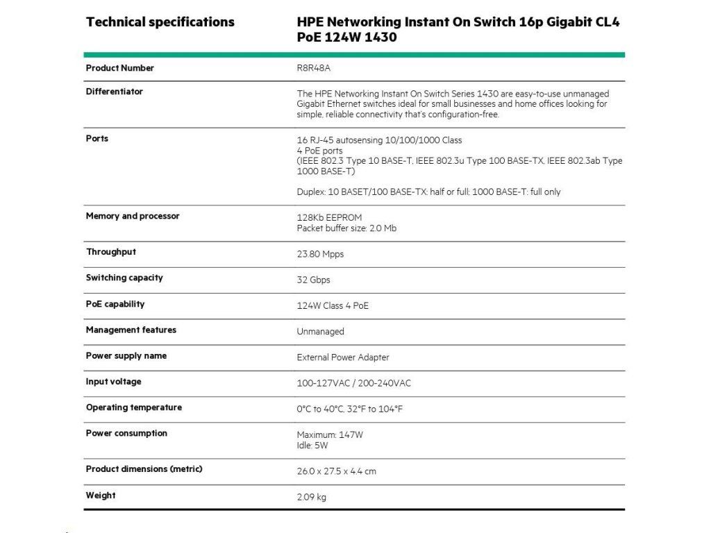 HPE Networking Instant On Switch 16p Gigabit CL4 PoE 124W 1430