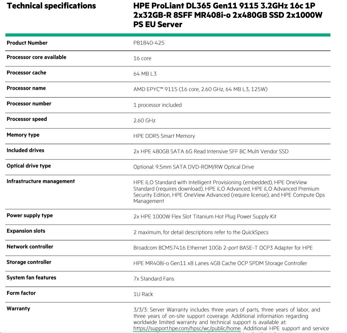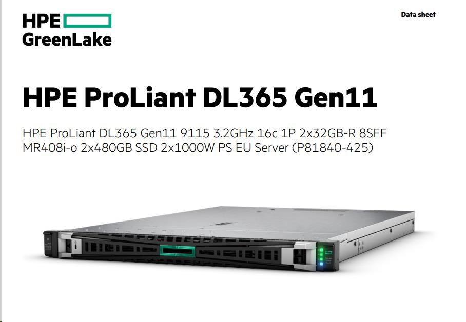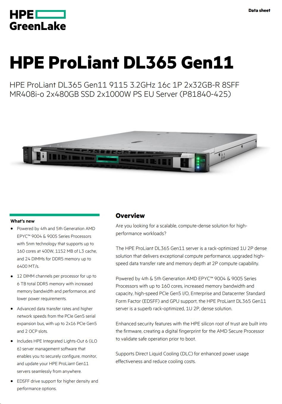 HPE PL DL365g11 AMD Epyc 9115 (2.6-4.1/16C) 2x32G-6400 2x480G MR408i-o/4G o2p10G-T 8SFF 2x1000W 1U Smart Choice