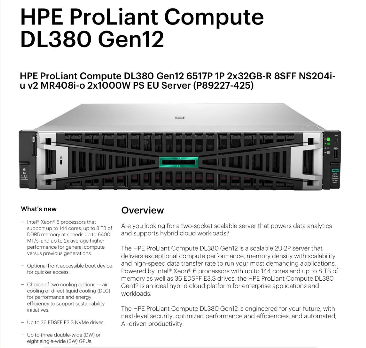 HPE PL DL380g12 6517P (3.2-4.2G/16C) 2x32G (P69727) NS204(2x480) MR408i-o 8SFF 2x1000W 2p10G-T NBD333 Smart Choice