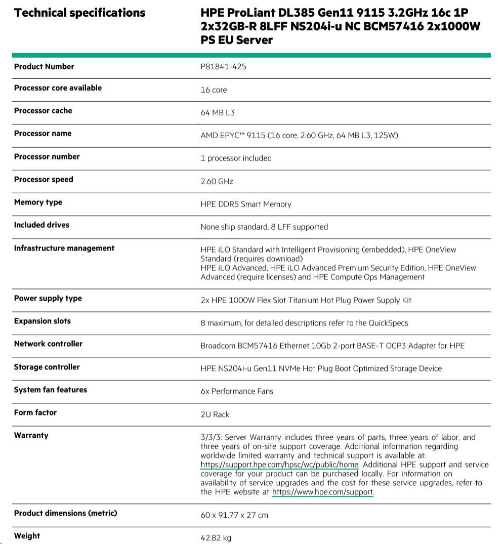 HPE PL DL385g11 AMD EPYC 9115 (2.6/16C) 2x32G (P64985) 2x480G MR408i-o 2x1000W 8SFF 2p10GT Smart Choice
