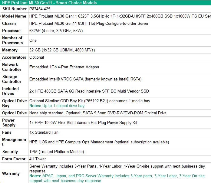 HPE PL ML30g11 6325P (3.5G/4C8T) 1x32G 2x480G SSD 8SFF VROC 1x1000W 4p1G NBD311 Smart Choice