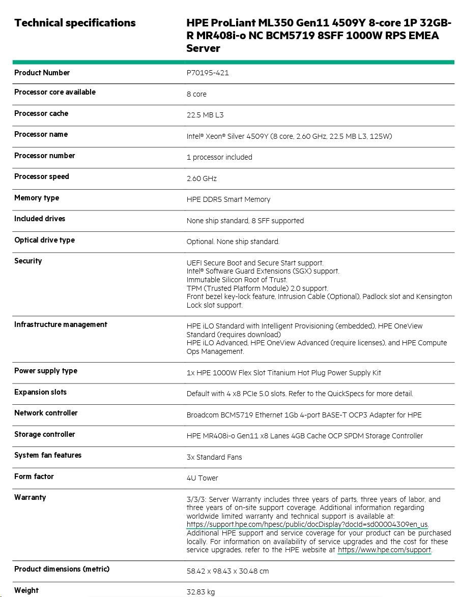 HPE PL ML350g11 4509Y (2.6G/8C) 1x32G (p64706) MR408i-o 8-24SFF 4p1G 1x1000W P70195-421 RENEW