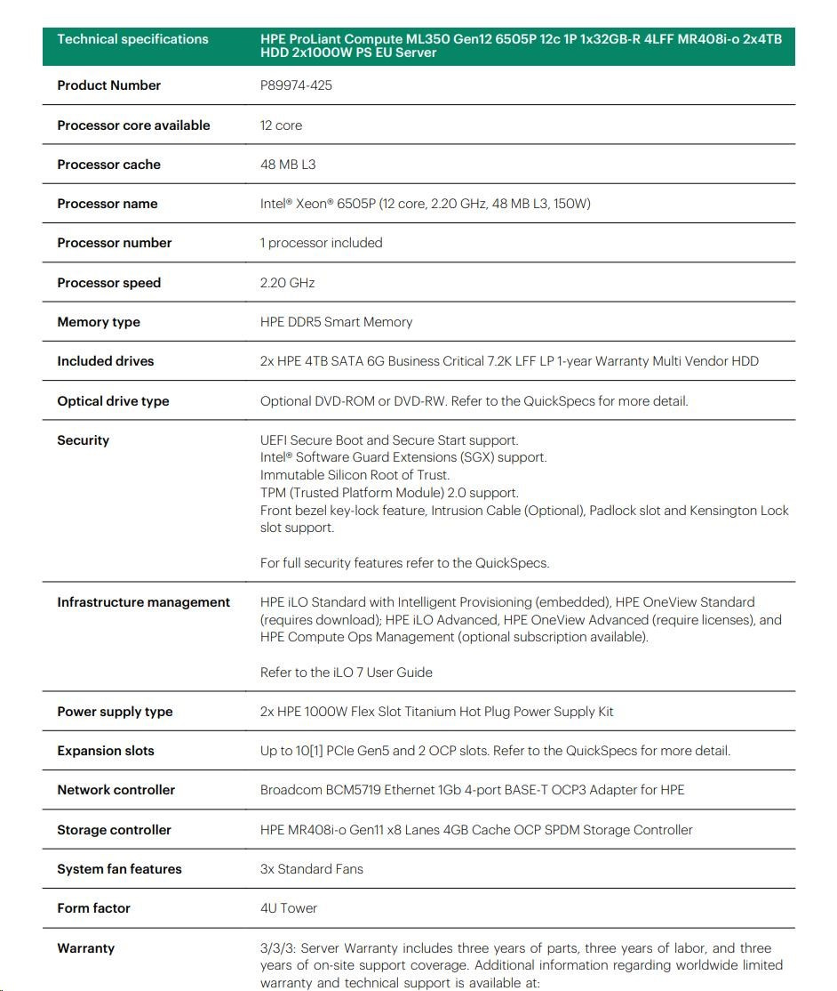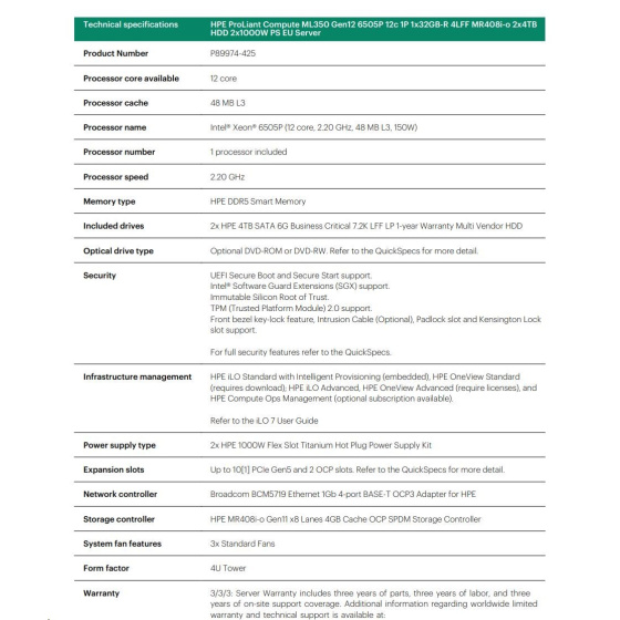 HPE PL ML350g12 6505P (2.2/12C) 1x32G (P69727) 2x4TB 4LFF MR408i-o2x1000W 1GbE NBD333 Smart Choice