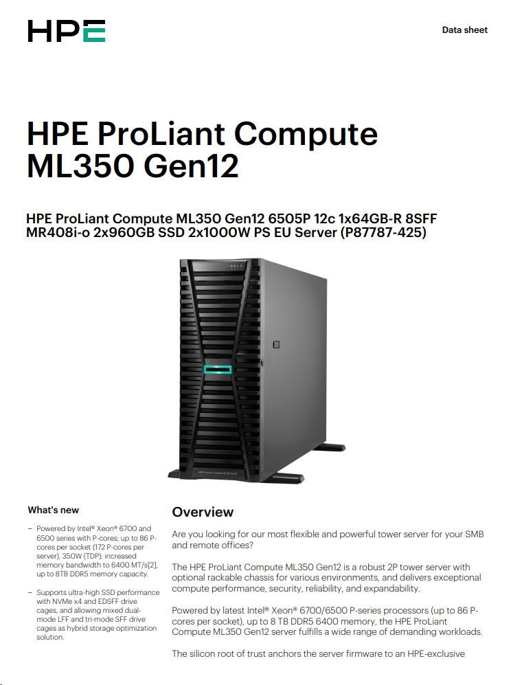 HPE PL ML350g12 6505P (2.2/12C) 1x64G (P69728) 2x960G MR408i-o 8SFF 2x1000W 1GbE NBD333 Smart Choice