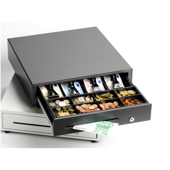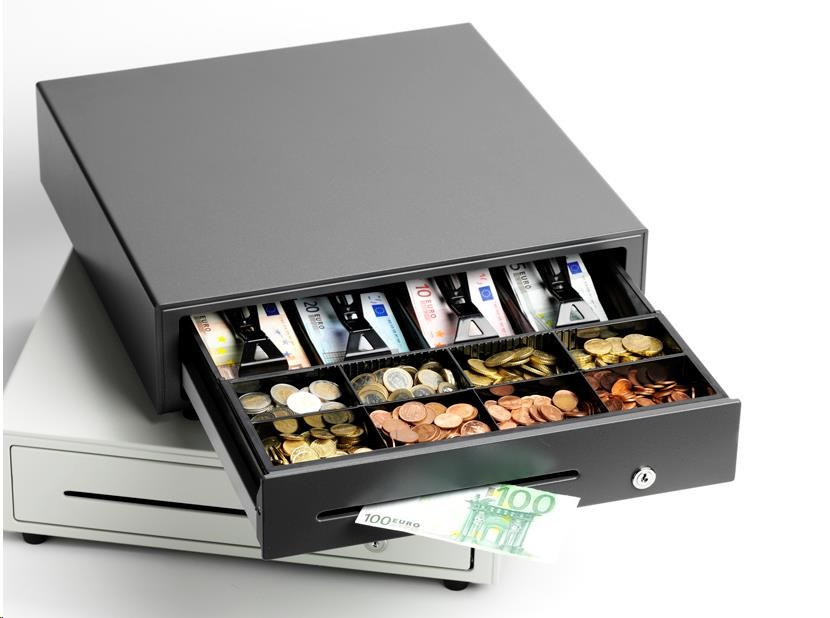pokladničná zásuvka, otváranie spredu, rozmery (ŠxVxH): 410x114x415mm, vložka: 4 priehradky na bankovky (horizontálne), 8 priehradiek na mince, 1 priehradka na účtenky, 3poz. zámok, priame pripojenie tlačiarne, farba: tmavosivá.
