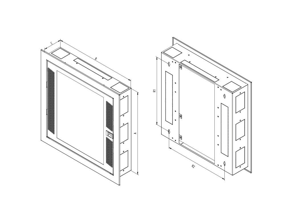 SPECIFIKACE Typ * RNA-03-A51-YXX-X2 výška A (mm) * 500 šířka B (mm) * 500 hloubka C (mm) * 110 Hmotnost brutto (kg) * 7 Hmotnost netto (kg) * 6,7 Rozteč pro zavěšení R1 * 410 Rozteč pro zavěšení R2 * 390 Počet modulů * 2 x 22 10“ prostup s přípravou pro zásuvky * 1 Otvor pro zásuvku * 1 Jedná se pouze o ilustrační foto.