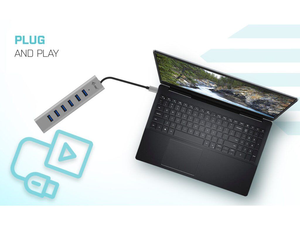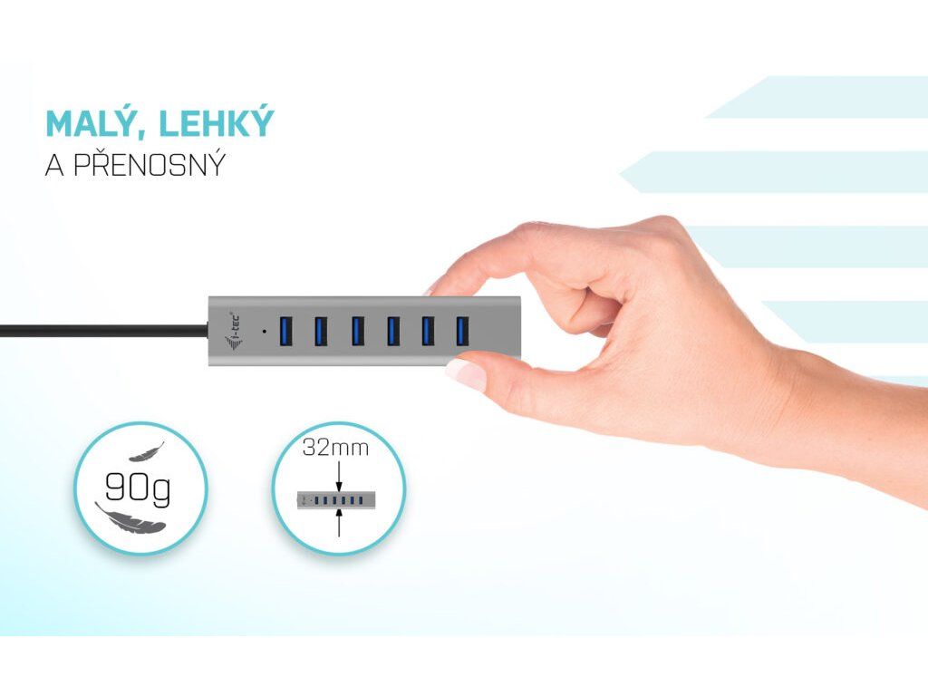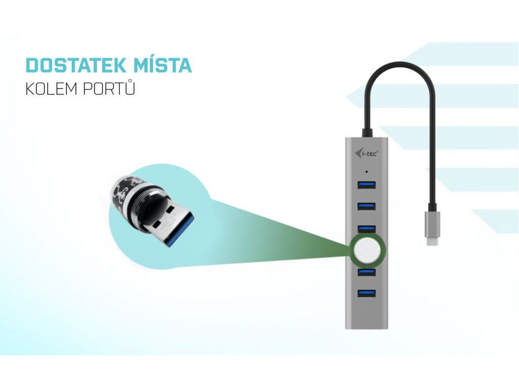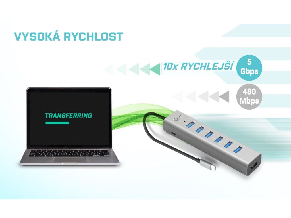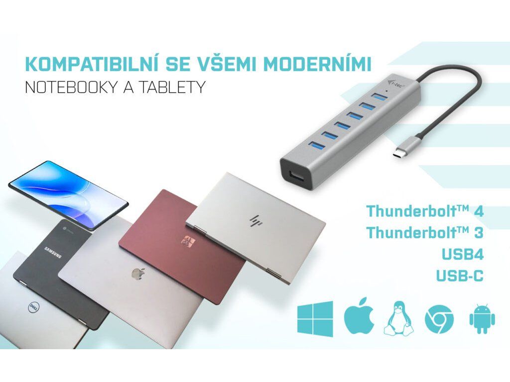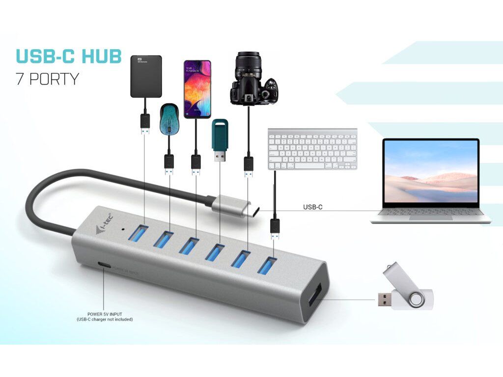 Popis USB-C, USB4 a ThunderboltTM 3 či 4 jsou na dnešních noteboocích a tabletech čím dál populárnější. Společně s jejich čím dál širším využívání ubývá na těle notebooků množství USB portů. A pokud potřebujete připojit ke svému zařízení příslušenství, na které již dostatek portů nemáte, můžete využít tohoto malého, ale šikovného rozbočovače, který navíc podporuje aktivní nabíjení. S tímto hubem získáte dalších 7 USB 3.0 portů (až 5 Gbps). Připojte si externí klávesnici a myš, přenášejte data nebo filmy z USB flash disku rychlostí až 5 Gbps nebo nabíjejte svá mobilní zařízení nabíjejte, až rychlostí 7.5W. Hub nevyžaduje instalaci ovladačů, pouze jej pomocí USB-C kabelu připojíte a můžete jej ihned začít využívat. Hub má vestavěnou přepěťovou ochranu vašeho počítače pro případ zkratu na periferních zařízeních. Díky kompaktním rozměrům a nízké hmotnosti jej můžete mít v brašně stále sebou – kovový povrch ostatně chrání hub před poškozením a před poškrábáním. Hub podporuje nabíjení, a to prostřednictvím externího USB-C adaptéru až 15W (5V, 3A)* * Adaptér není součástí balení.
