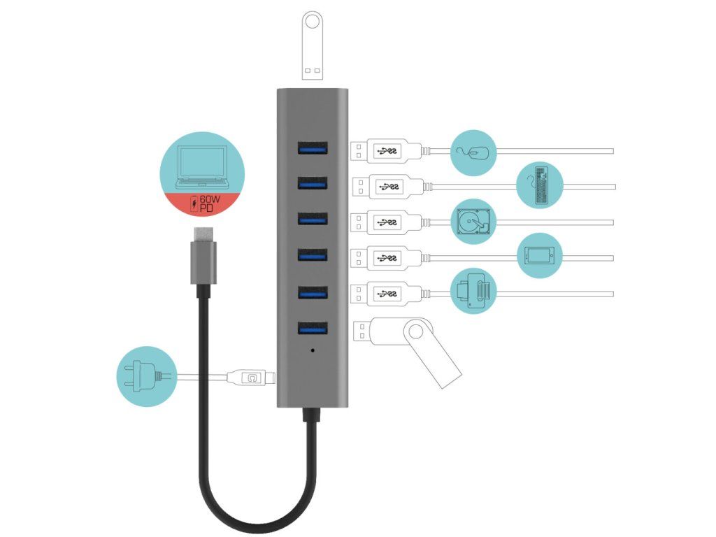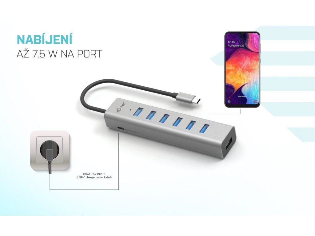 • Nabíjecí HUB USB-C až pro 7 zařízení • Kompatibilní se všemi notebooky nebo tablety s porty USB-C, USB4 nebo Thunderbolt • Kovové tělo nabízí maximální odolnost a ochranu • Díky malým rozměrům se HUB snadno přenáší i v kapse • 7x USB 3.0 portů nabízí možnost připojení různých periferií i rychlého HDD/SSD nebo flash disku pro rychlý přenos dat • Rychlost nabíjení až 7,5 W na port • Přídavný port USB-C pro nabíjení portů HUB s výkonem až 15 W (adaptér není součástí dodávky) • HUB podporuje všechny běžné současné operační systémy (Windows, macOS, Linux, Android, Chrome OS, iPadOS)