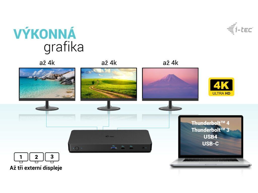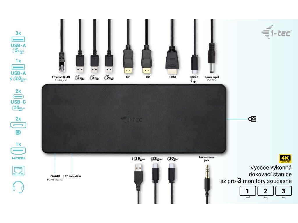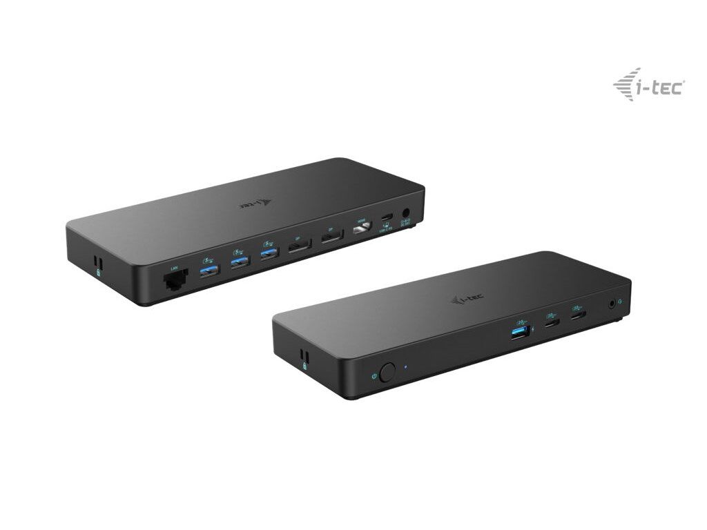 Rozlišení: Hostitelské zařízení s podporou DisplayPort 1.2: • 1 monitor – 1x DP nebo HDMI › až 4K/30Hz • 1 monitor – 1x DP nebo HDMI › až 1080p/120Hz • 2 monitory – 1x DP + 1x HDMI › až 2x 1080p/60Hz*. • 2 monitory – 2x DP › až 2x 1080p/60Hz* • 3 monitory – 1x DP + 1x DP + 1x HDMI › až 1x 1080p/60Hz + až 2x 720p/60Hz* Hostitelské zařízení s podporou DisplayPort 1.4: • 1 monitor – 1x DP nebo HDMI › až 4K/60Hz • 2 monitory – 1x DP + 1x HDMI › až 2x 1440p/60Hz* • 2 monitory – 1x DP + 1x HDMI › až 2x 4K/30Hz* • 2 monitory – 2x DP › až 2x 4K/30Hz* • 3 monitory – 1x DP + 1x DP + 1x HDMI › až 3x 1080p/60Hz* Hostitelské zařízení s DisplayPortem 1.4 s podporou DSC: • 1 monitor – 1x DP nebo HDMI › až 4K/60Hz • 1 monitor – 1x DP › až 4K/144Hz nebo 1440p/240Hz nebo 1080p/360Hz • 1 monitor – 1x HDMI › až 1440p/144Hz nebo 1080p/240Hz • 2 monitory – 1x DP + 1x HDMI › až 2x 4K/60Hz* • 2 monitory – 1x DP + 1x HDMI › až 2x 1440p/144Hz* • 3 monitory – 1x DP + 1x DP + 1x HDMI › až 3x 4K/30Hz* • 2x USB-C 3.2 Gen2 (pouze data) • 3x USB 3.2 Gen1 (5Gbps) • 1x USB 3.2 Gen2 (10Gbps) s podporou rychlého nabíjení (BC 1.2) • 1x Ethernet GLAN RJ-45 port (Realtek RTL8153) • 1x 3,5mm Audio kombo konektor • 1x vstup pro napájení (20V/6.5A) • Klonování MAC adresy: ano (za použití software i-tec Docker Pro) • WOL: S1, S2, S3 • Přepínač ON/OFF pro zapnutí a vypnutí dokovací stanice • LED indikace • Podpora pro Kensington lock • Podpora pro VESA uchycení • Kabel USB-C 3.2 Gen2 (100 cm) • OS: Windows 10/11, macOS, Android, Chrome OS a Linux s nejnovějšími aktualizacemi • Rozměry produktu: 212 x 82 x 23 mm • Hmotnost produktu: 366 g