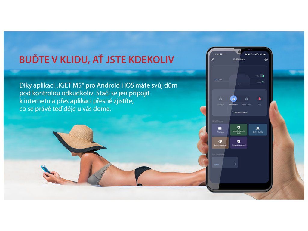 Mějte svůj domov pod kontrolou s inteligentním zabezpečovacím systémem iGET SECURITY M5-4G Premium. Je bezdrátový, s vaším telefonem komunikuje přes 4G LTE, WiFi a Ethernet. Při výpadku Internetu se přepojí na 4G LTE, umí také posílat SMS zprávy pomocí GSM. Rozumí si s Androidem i iOS, můžete s ním sledovat vnitřní a venkovní IP kamery, řídit 230V zásuvky a dalších více než 20 typů příslušenství. Výdrž bateriií v příslušentví je až 5 let a dosah k alarmu až 1 km. Alarm dále nabízí připojení na pult centrální ochrany, režim opatrování, funkci domovního zvonku nebo speciální smart funkce a tlačítka. Nejvyšší zabezpečení komunikace je 256 bit a upravit nastavení alarmu můžete vzdáleně odkudkoliv. Manuál i aplikace jsou kompletně v českém, slovenském, polském, maďarském a anglickém jazyce. iGET SECURITY M5-4G Premium je ideální inteligentní systém pro zabezpečení veškerých budov - domů, bytů, chat, kanceláří, garáží, obchodů, skladů, úřadů apod. Jedná se o bezdrátový alarm s jednoduchou instalací a ovládáním, který váš dům nejen zabezpečí. Můžete přes něj dálkově nebo dle časovače spouštět elektrické spotřebiče pomocí řízených zásuvek, a také kdykoliv sledovat dění pomocí IP kamer. V případě poplachu alarm spustí nahrávání na této IP kameře a video sdílí s aplikací ve vašem mobilním telefonu. Veškeré senzory jsou bezdrátové, většina je napájena bateriemi s výdrží až 5 let, hlavní jednotka je napájena ze sítě 230 V (ale má také vlastní záložní baterii s výdrží min. 8 hod). Díky tomu je objekt neustále střežen ze záložní baterie, to i při výpadku elektrického proudu. Má také zálohu připojení k Internetu, při výpadku připojení pomocí WiFi nebo Ethernet kabelu se automaticky přepojí na 4G LTE datovou síť, nebo obráceně. Umí také odesílat SMS zprávy o stavu alarmu a poplachu.