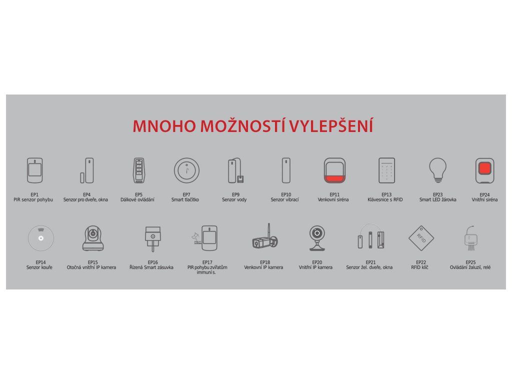 Obsah balení: 1x M5 – centrální zabezpečovací jednotka, zajišťuje řízení veškerých bezdrátových senzorů a celou kontrolu systému. Komunikuje pomocí GSM 4G LTE/WiFi/Ethernet. 1x EP13 – bezdrátová klávesnice s RFID čtečkou, ovládá stav alarmu zadáním kódu nebo přiložením RFID klíče. 1x EP1 – bezdrátový pohybový PIR senzor pro zajištění místnosti. 1x EP4 – bezdrátový magnetický senzor pro zajištění dveří a oken. 1x EP5 – dálkové ovládání (klíčenka), pro rychlé ovládání alarmu, obsahuje nastavitelné Smart tlačítko. 1x EP22 – RFID klíč pro přiložení k bezdrátové klávesnici EP13, pro rychlou aktivaci a deaktivaci alarmu. 2x Varovné nálepky informující o přítomnosti zabezpečovacího zařízení. 2x napájecí adaptér pro alarm M5 a klávesnici EP13. 1x UIG – uživatelský manuál v českém, slovenském, polském, anglickém a maďarském jazyce 1x Ethernet kabel RJ45.