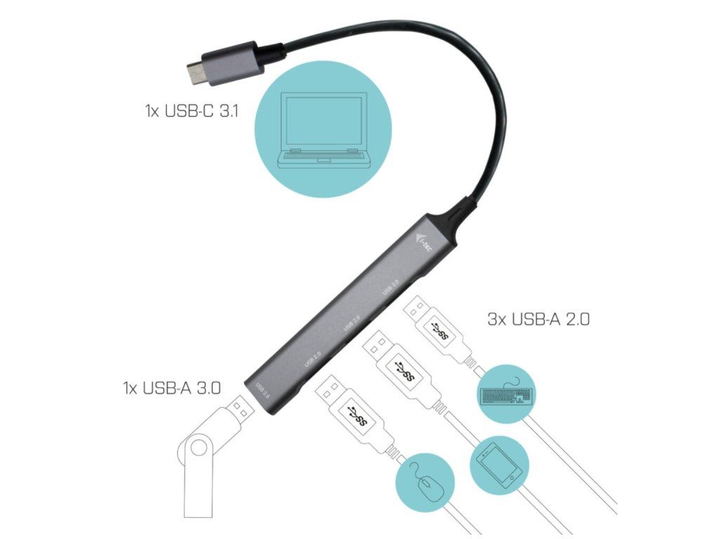 USB-C a Thunderbolt“ 3 či 4 jsou na dnešních noteboocích a tabletech čím dál populárnější. Společně s jejich čím dál širším využívání ubývá na těle notebooků množství USB portů. A pokud potřebujete připojit ke svému zařízení příslušenství, na které již dostatek portů nemáte, můžete využít tohoto malého, ale šikovného rozbočovače. S tímto hubem získáte další 4 další USB: standardní USB 3.0, a tři USB 2.0 porty. Připojte si externí klávesnici a myš, přenášejte data nebo filmy z USB flash disku rychlostí až 5 Gbps nebo nabíjejte svá mobilní zařízení nabíjejte (standardní USB rychlostí 0.9A). Hub nevyžaduje instalaci ovladačů, pouze jej pomocí USB-C kabelu připojíte a můžete jej ihned začít využívat. Hub má vestavěnou přepěťovou ochranu vašeho počítače pro případ zkratu na periferních zařízeních. Díky kompaktním rozměrům a nízké hmotnosti jej můžete mít v brašně stále sebou – kovový povrch ostatně chrání hub před poškozením a před poškrábáním.
