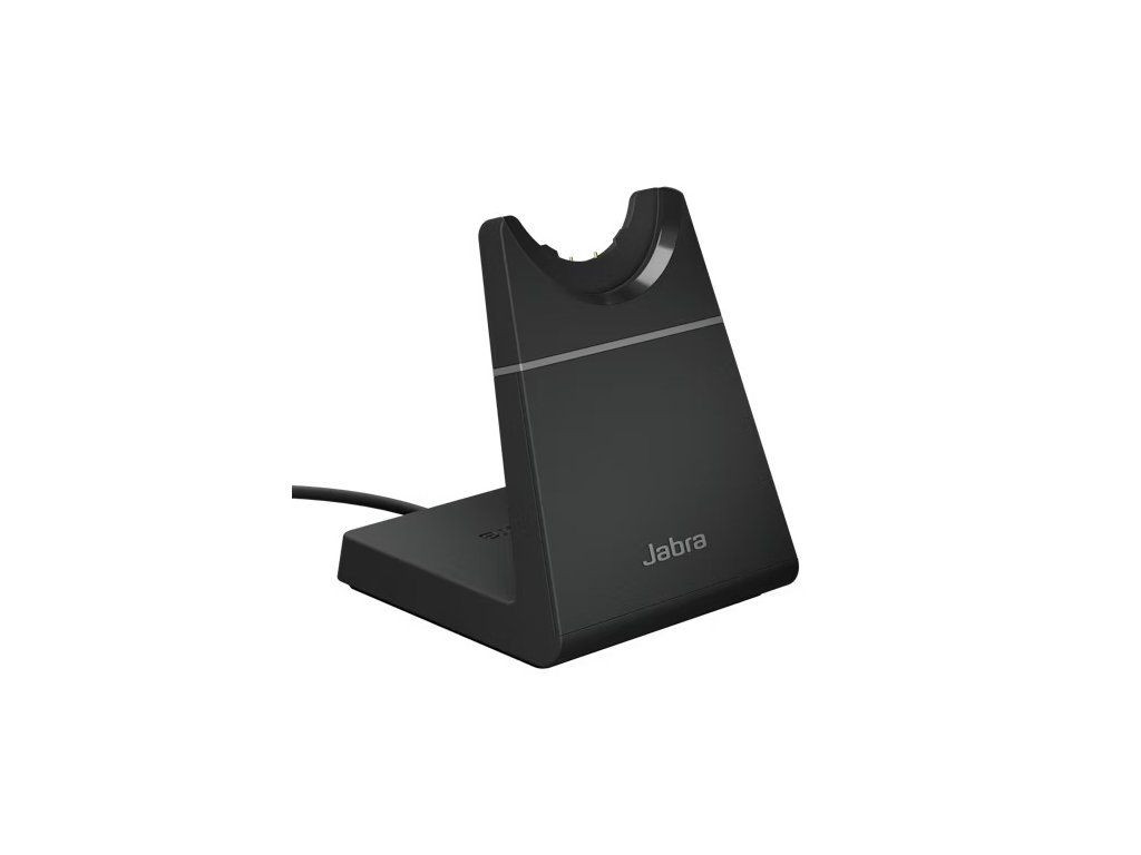 Nabíjecí stojan pro Jabra Evolve2 65 TE umožňuje snadné a pohodlné nabíjení a skladování na pracovním stolu.