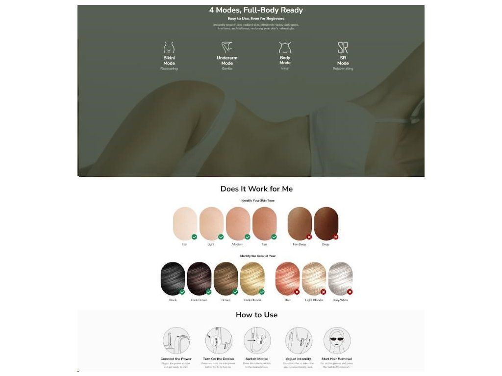 - Cielená starostlivosť pre celé telo: Niekoľko režimov a úrovní intenzity pre bezpečné ošetrenie nôh, rúk, podpazušia, oblasti bikín aj tváre.
