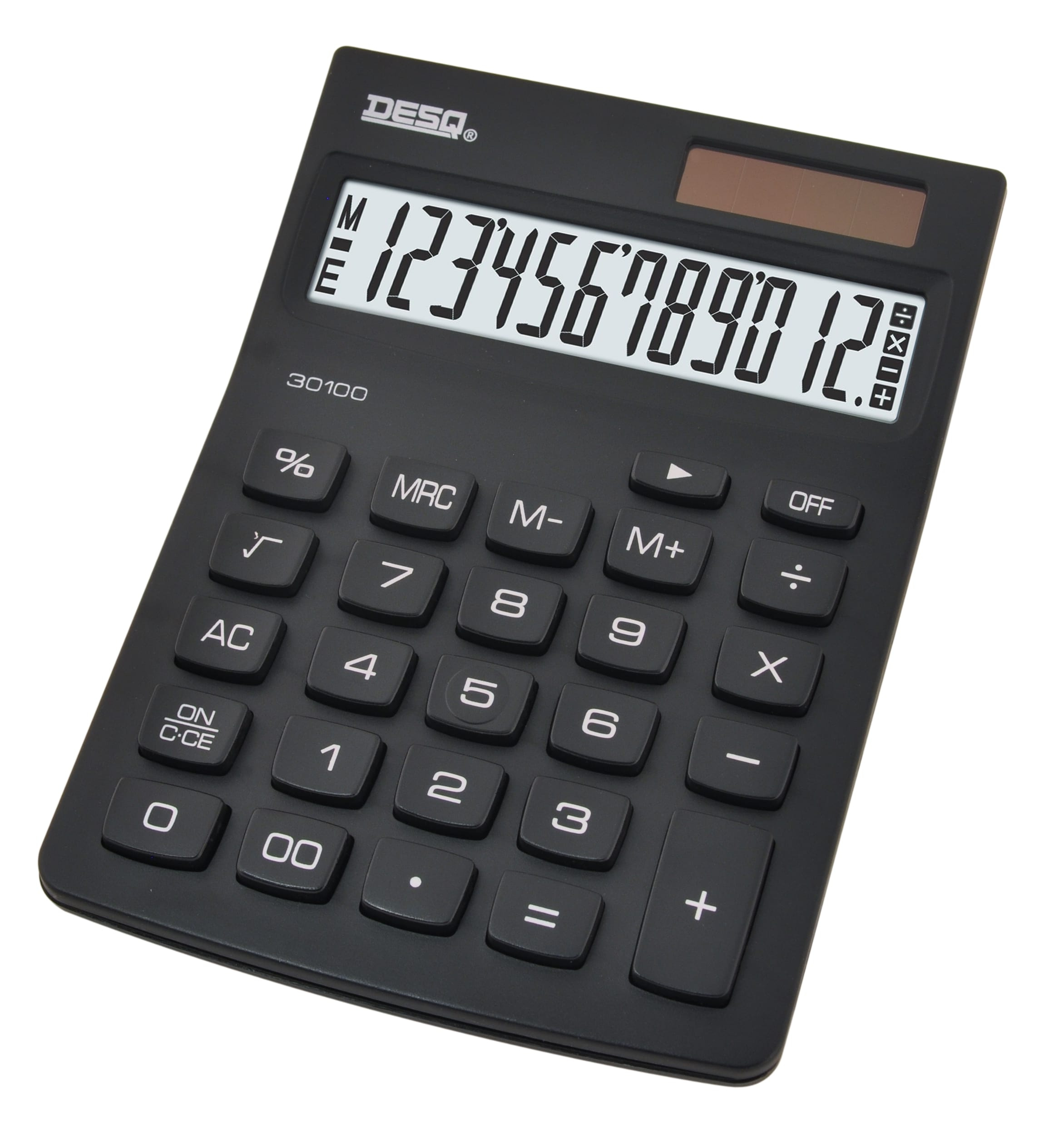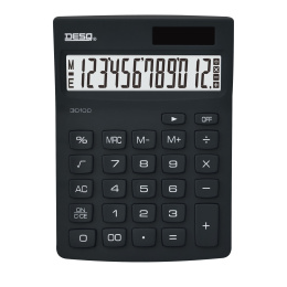 Stolní kalkulačka v černé barvě 12ti místný LCD displej Funkce Backspace, tlačítko s dvojitou nulou Tlačítka pro výpočet procent a odmocniny Trojciferná interpunkce 3 tlačítková paměť Automatické vypnutí, které šetří energii Napájení pomocí solárního panelu nebo baterie AG10 / LR1130 (součástí balení) Hmotnost 110 g Rozměr 142 x 102 x 31 mm