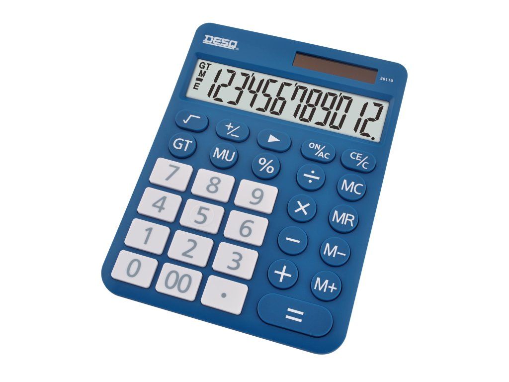 Velká stolní kalkulačka v tmavě modré barvě 12ti místný LCD displej Velká tlačítka Funkce MU, GT, Backspace, tlačítko s dvojitou nulou, tlačítko (+/-) Tlačítka pro výpočet procent a odmocniny Trojciferná interpunkce 4 tlačítková paměť Automatické vypnutí, které šetří energii Napájení pomocí solárního panelu nebo baterie AAA (součástí balení) Hmotnost 200 g Rozměr 185 x 140 x 30,5 mmDodatočné parametre