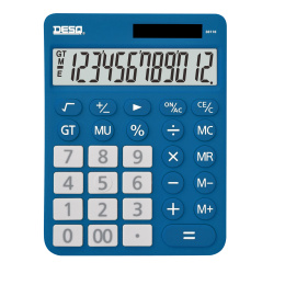 Velká stolní kalkulačka v tmavě modré barvě 12ti místný LCD displej Velká tlačítka Funkce MU, GT, Backspace, tlačítko s dvojitou nulou, tlačítko (+/-) Tlačítka pro výpočet procent a odmocniny Trojciferná interpunkce 4 tlačítková paměť Automatické vypnutí, které šetří energii Napájení pomocí solárního panelu nebo baterie AAA (součástí balení) Hmotnost 200 g Rozměr 185 x 140 x 30,5 mm