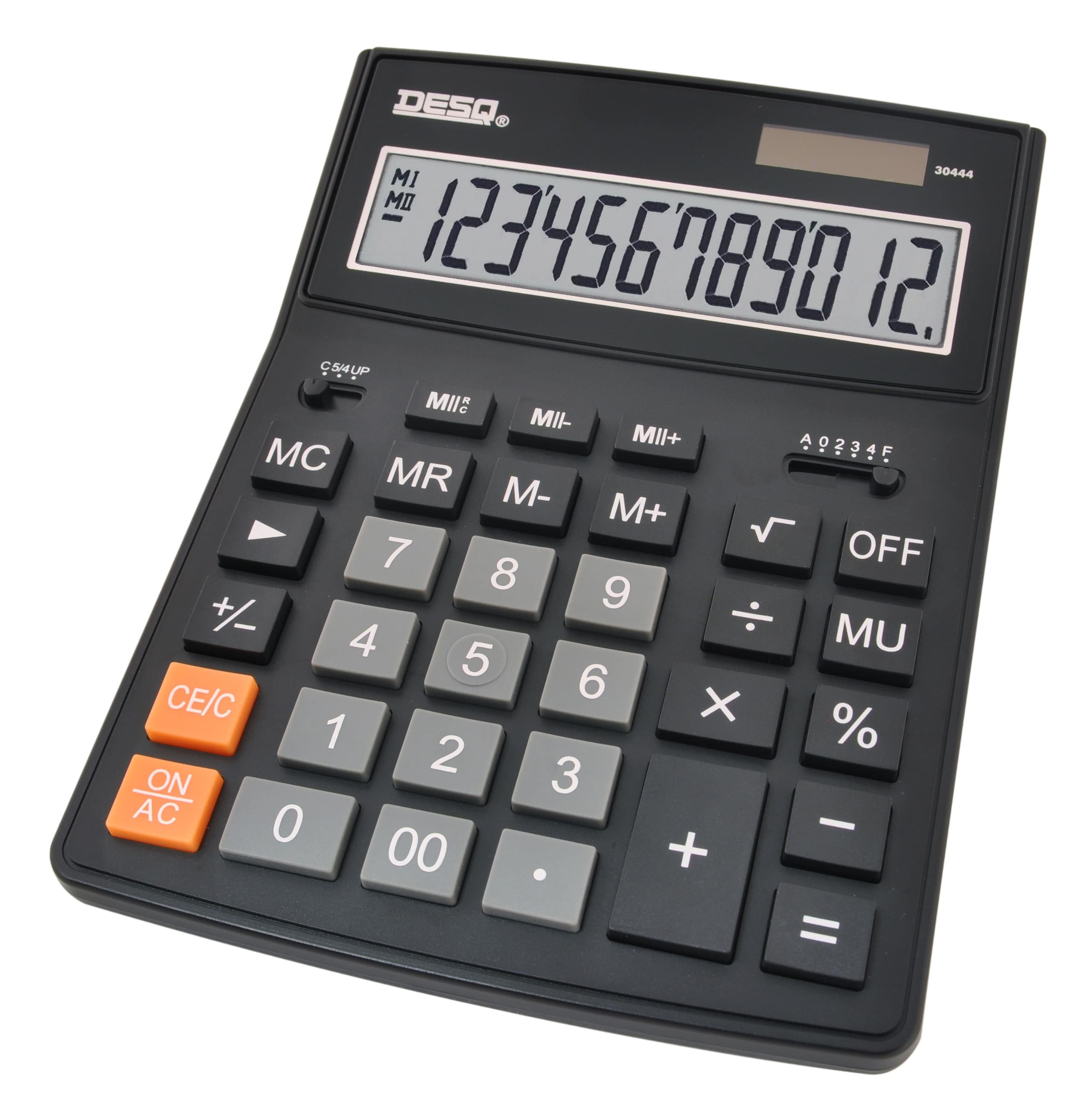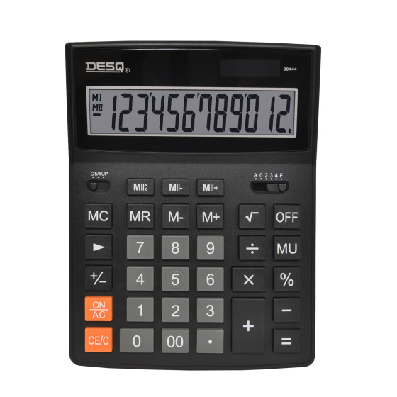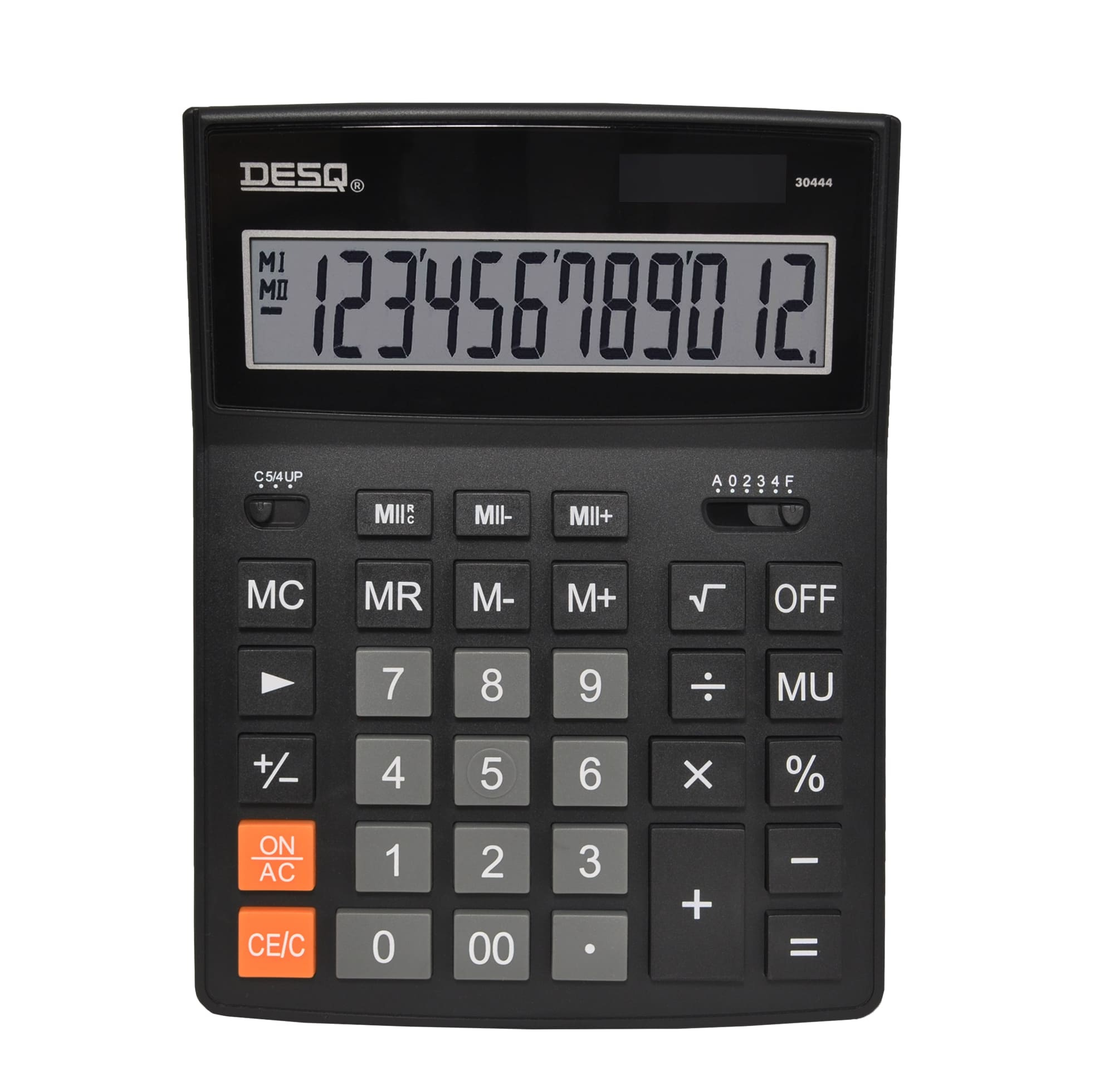 - Odolná stolní kalkulačka - 12ti místný LCD displej - Velká tlačítka - Krytý displej z akrylátového skla - Funkce MU, Backspace, tlačítko s dvojitou nulou, tlačítko (+/-) - Nastavení zaokrouhování a desetinných míst - Tlačítka pro výpočet procent a odmocniny - Trojciferná interpunkce - Dvojitá 3 tlačítková paměť - Automatické vypnutí, které šetří energii - Napájení pomocí solárního panelu nebo baterie CR44 / LR44 (součástí balení) - Hmotnost 270 g - Rozměr 205 x 155 x 40 mm