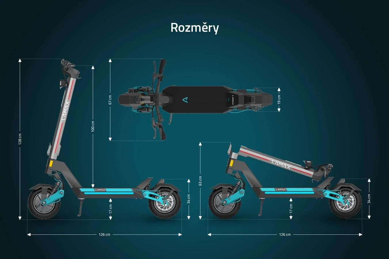 Rozmery (zložená): 126 × 67 × 63 cm (dĺžka, šírka, výška)