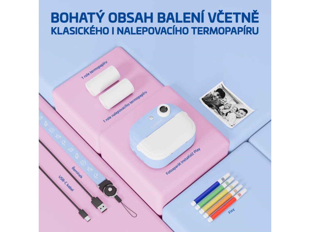 LAMAX InstaKid2 Play je foťák, ktorý nestráca čas. Deti si s ním jednoducho zaznamenajú každý dôležitý moment a počas sekundy ho majú v ruke. Čiernobiele snímky sa môžu premeniť na farebné spomienky pomocou fixiek, ktoré sú súčasťou balenia – stačí ich len vyfarbiť, pridať do vlastného albumu alebo nimi potešiť napríklad babičku. Vďaka jednoduchému ovládaniu, dvom ruličkám v balení (vrátane samolepiacej), originálnemu dizajnu a výkonnej kamere so 48 Mpx a FullHD videom, sa foťák stane nepostrádateľným spoločníkom na výlety, oslavy aj tvorivá popoludní s kamarátmi. Obľúbia si ho aj staršie deti, ktoré si môžu svoje snímky aj videá ukladať na microSD kartu a uchovať si tak svoje prvé filmárske pokusy. Na výber je ružová alebo modrá varianta a nechýba ani praktická šnúrka na krk, aby mali deti foťák stále po ruke. A keď práve nefotí? Zábavu zaistí päť hier priamo vo fotoaparáte. Tento foťáčik totiž nie je len o spomienkach, je tiež o radosti, sebavyjadrení a fantázii.