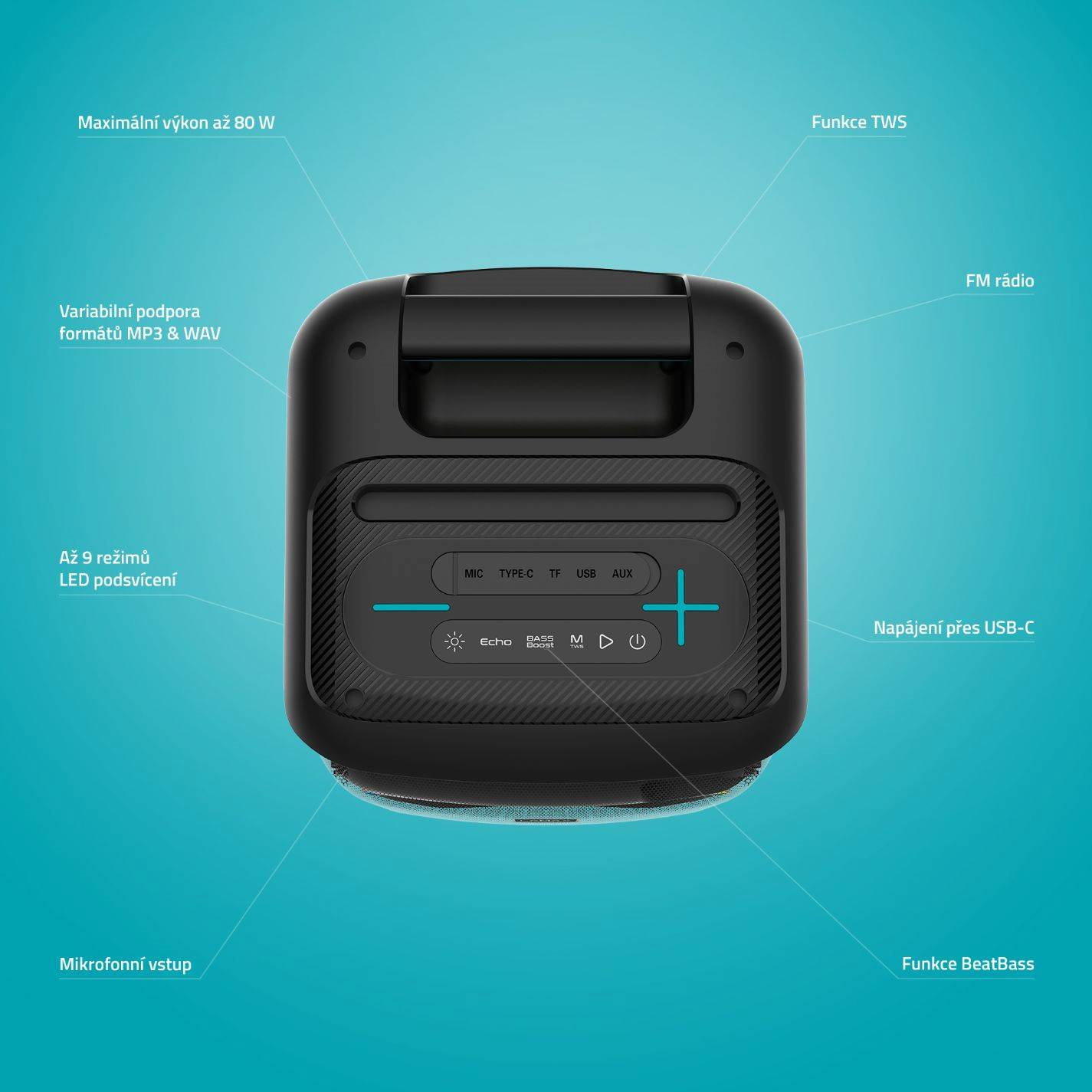 Reprak prehrá playlisty najrôznejších formátov (MP3 a WAV) a veľmi variabilné je aj čo sa pripojenie týka, takže podporuje micro SD, USB-A, AUX a nechýba ani vstup pre mikrofón. Pokiaľ práve nemáš po ruke vlastnú muziku, integrované FM rádio ti naladí obľúbenú stanicu a zábava môže začať. Rozprúdiš ju ešte viac, keď vezmeš do ruky pribalený bezdrôtový mikrofón a budeš moderovať, spievať alebo treba rapovať.