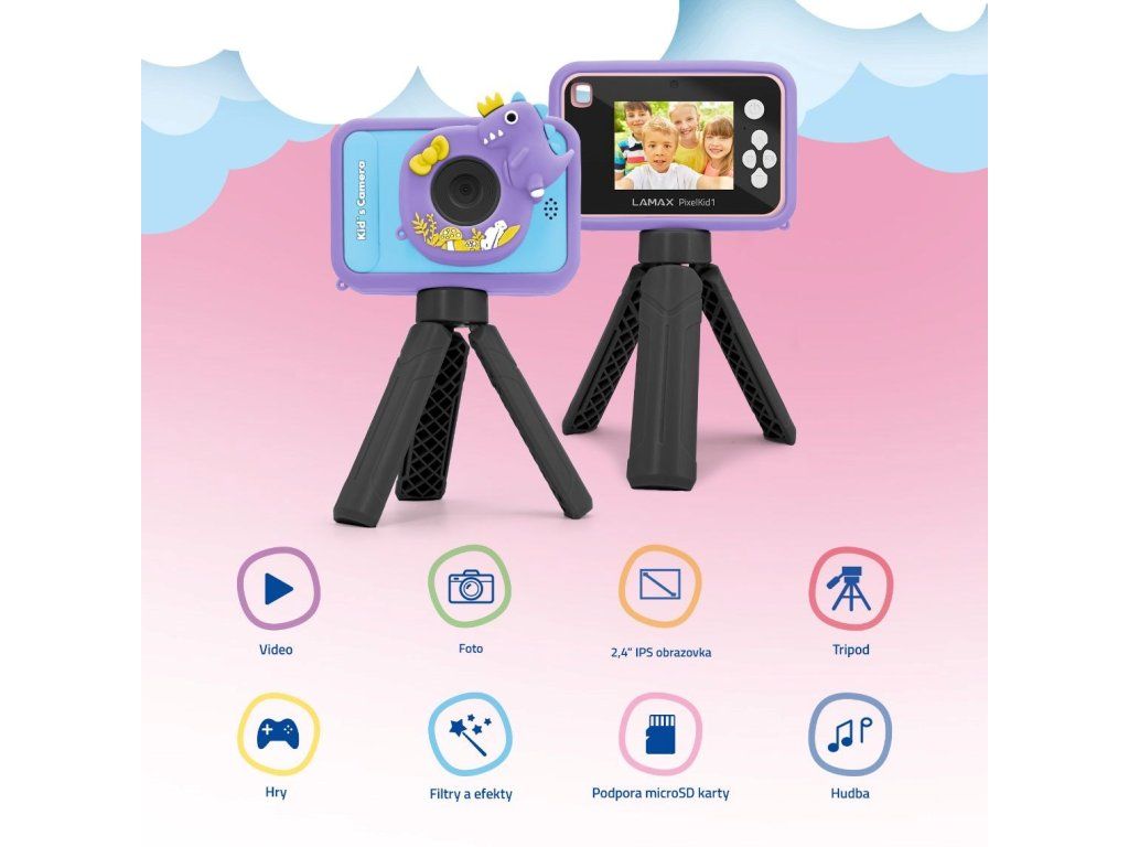 Prirodzenú detskú zvedavosť a kreativitu treba podporovať, preto prichádza LAMAX PixelKid1. Detský fotoaparát prispeje k rozvoju talentu malých fotografov, ktorí ho užijú na výletoch, rodinných oslavách alebo napríklad školských akciách. Okrem fotenia v rozlíšení 8 Mpx, zvláda foťák aj vytvorenie video záznamu vo Full HD a deťom ponúka aj päť rôznych hier na zabavenie, keď čakajú na záber. Pocit profesionality dodá menším aj väčším fotografom pribalený tripod a možnosť použitia niekoľkých filtrov a efektov na ozvláštnenie fotiek. Cool design v ružovom alebo modrom prevedení si dieťa okamžite zamiluje, a obzvlášť menšie ratolesti ocenia parádne silikónové ochranné puzdro s dinosaurom. Vlastný osobitý štýl potom foťáku dodajú nalepením samolepiek, ktoré nájdu v balení. Všetky záznamy vrátane autoportrétov zo selfie kamery sa ukladajú na microSD kartu. A ešte jednu šikovnú vlastností foťák vyniká, zvláda prehrávať MP3. Dieťa tak zaujme a zabaví po všetkých stránkach.