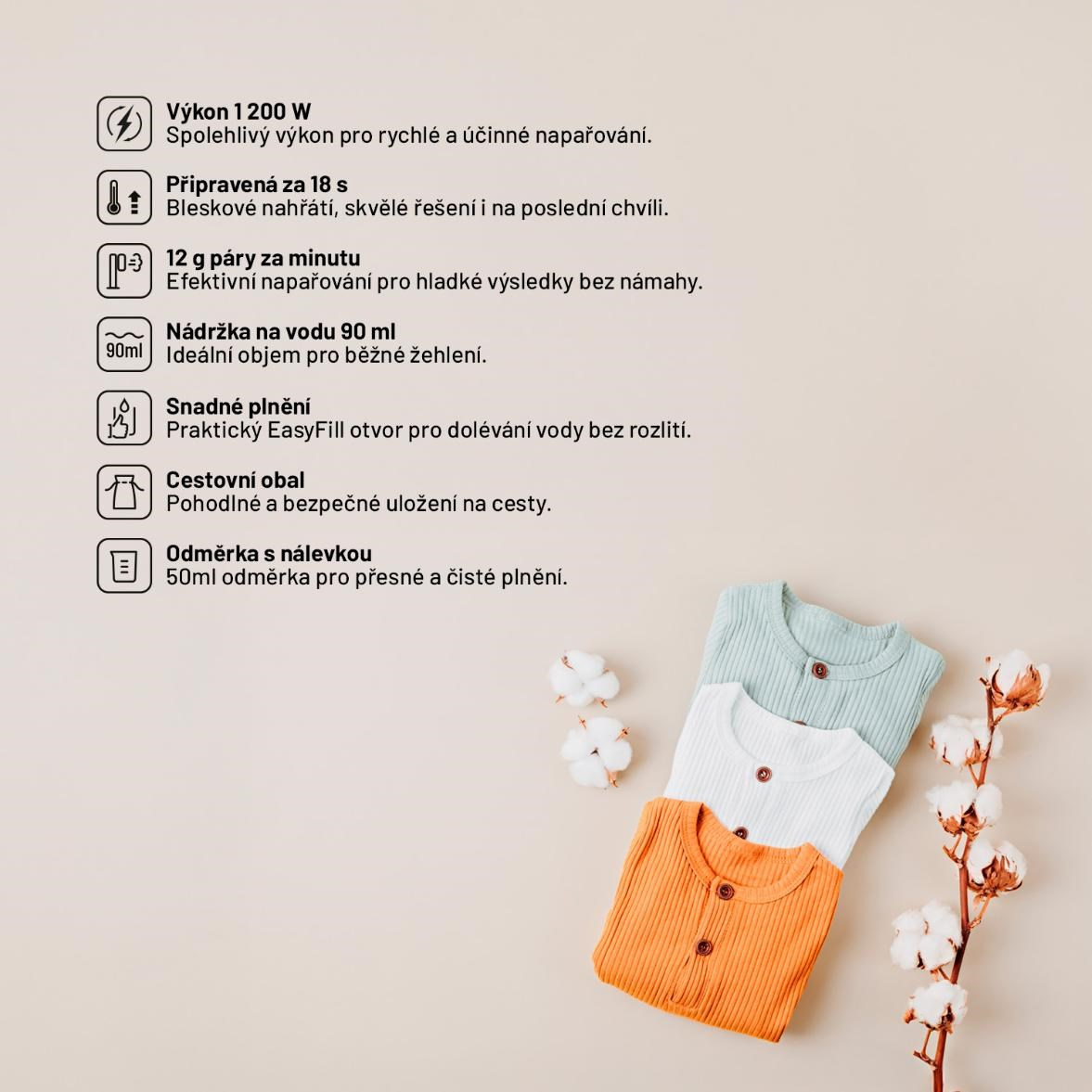 Silný výkon 1 200 W zabezpečí, že para bude nekompromisná voči záhybom, ale šetrná k vášmu oblečeniu. Prístroj je navrhnutý tak, aby zvládol aj hustejšie tkaniny, bez toho, aby ich poškodil. Predhrievanie trvá iba 18 sekúnd, takže napaľovačka je takmer okamžite pripravená. Rýchly štart oceníte najmä v zhone, napríklad pred dôležitým pracovným stretnutím alebo večernou udalosťou. Parný výkon dosahuje až 12 gramov pary za minútu, čo je dostatočné množstvo na efektívne a rovnomerné napaľovanie. Para preniká hlboko do tkaniny, takže oblečenie nielen vyhladíte, ale aj osviežite.