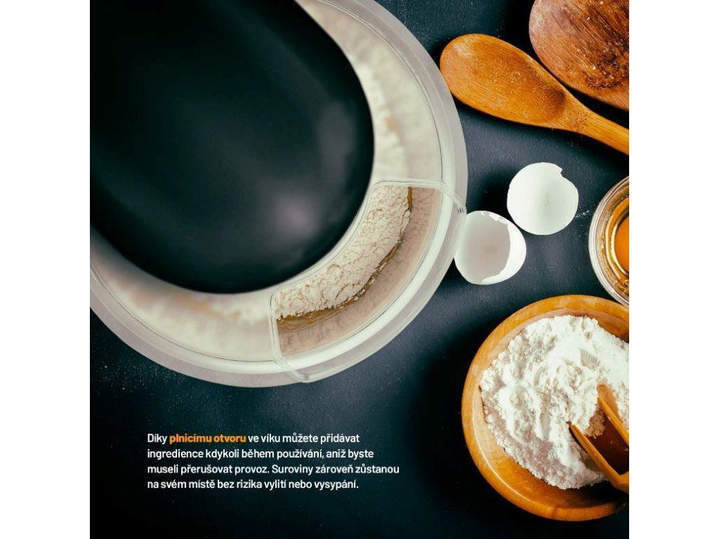 Určite nechcete po prvom mixovaní maľovať kuchyňu, preto je misa vybavená vekom, ktoré nehodám zabráni. Jeho plniaci otvor navyše umožňuje pridávať ingrediencie aj počas prevádzky. Ovládanie tohto pomocníka je veľmi jednoduché, stačí na to jediné koliesko. Na používanie tzv. One Touch systému si vystačíte s jednou rukou a podobne jednoduchá je aj výmena nadstavcov. K tomuto účelu slúži zdvíhacie rameno s Pop-up systémom.