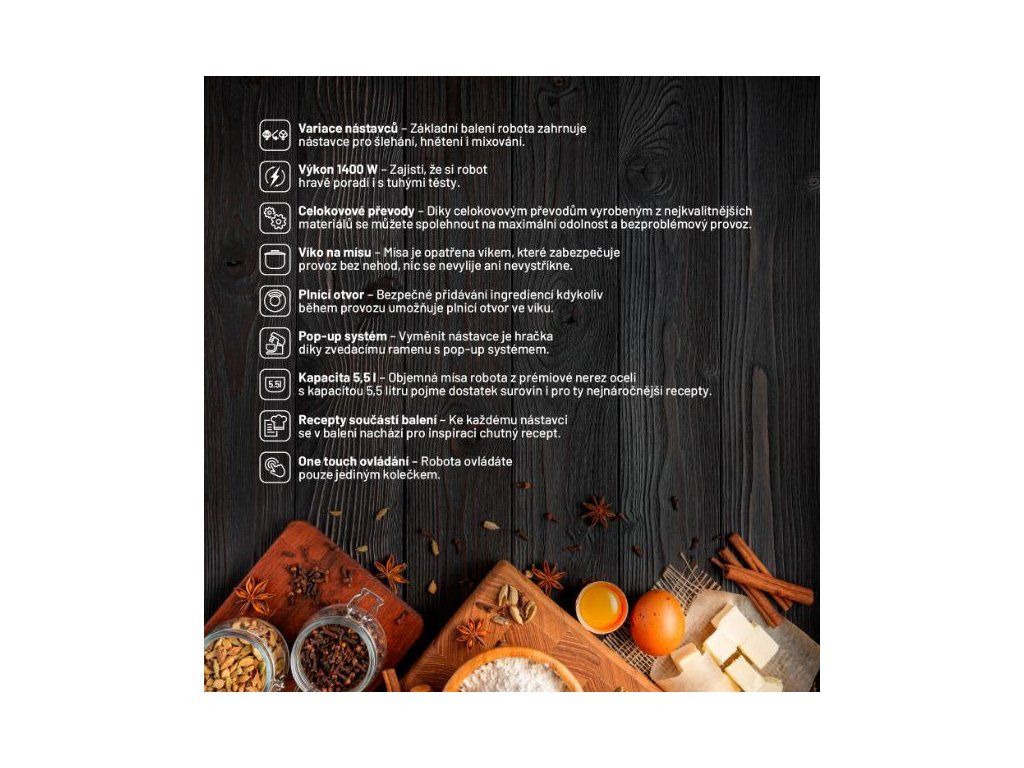 Šéf kuchyne, ktorý vám uľahčí prácuVarenie a pečenie sa stane ešte väčšou zábavou, s viacúčelovým kuchynským robotom Lauben Kitchen Machine 550BC s výkonom 1400 W všetko zvládnete ľahko a rýchlo. Netreba sa báť ani prípravy tuhšieho cesta, celokovové prevody si s vysokou záťažou poradia. Misa s objemom 5,5 l z nerezovej ocele pojme skutočne veľa a veko bráni úniku obsahu pri spracovaní. Suroviny je možné počas prevádzky pridávať cez plniacu otvor vo veku. Pri všetkom, čo dokáže, je robot menších rozmerov a nezaberie tak na linke príliš miesta. Svojim dizajnom ju však bude aj zdobiť. Prístroj pohodlne ovládate jednou rukou vďaka One Touch systému, manipuláciu uľahčuje tiež Pop-up systém slúžiaci k výmene nadstavcov. Robot disponuje hneď niekoľkými nadstavcami, pre miešanie, šľahanie či miesenie a ku každému z nich nájdete v balení chutný recept na inšpiráciu.