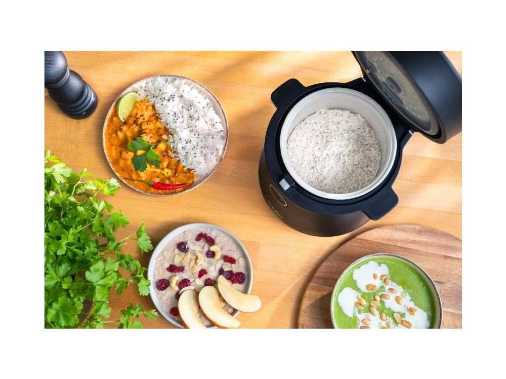 Ovládanie multifunkčného rýžovaču zvládne úplne každý pomocou prehľadného dotykového displeja, kde stlačením tlačidla aktivujete zvolenú funkciu alebo si manuálne nastavíte hodnoty podľa potreby. V 1,5 l hrnci s nepriľnavým povrchom pohodlne pripravíte jedlo pre celú rodinu alebo spoločenské stretnutie. Stačí ho potom vyňať a vložiť do umývačky, žiadne zložité drhnutie. Súčasťou balenia je tiež praktická odmerka a lyžica na ryžu.