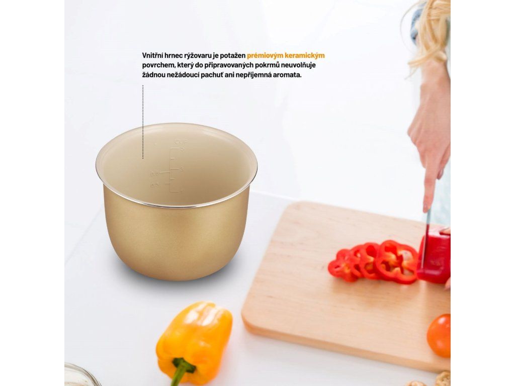 Vnútorný hrniec rýžovaču je potiahnutý prémiovým keramickým povrchom, ktorý do pripravovaných pokrmov neuvoľňuje žiadnu nežiaducu pachuť ani nepríjemné arómy. Povrch je navyše nepriľnavý, takže sa nič nepáli.