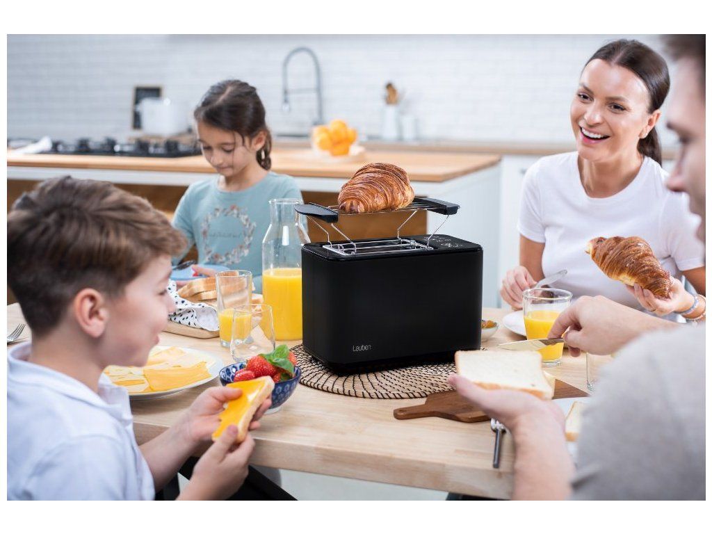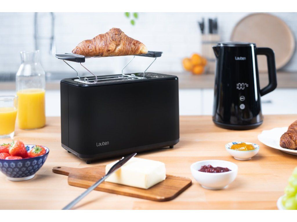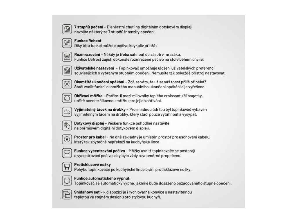 Lauben Toaster 900BC – chrumkavá raňajky za pár minút Chrumkavý toast na raňajky natretý maslom predstavuje pre mnohých dokonalý začiatok dňa. S Lauben Toaster 900BC získajú vaše raňajky či desiaty úplne nový rozmer, vďaka digitálnemu nastaveniu na dotykovom displeji máte na výber zo 7 stupňov intenzity opečenia. Dokonca si môžete uložiť svoj obľúbený stupeň opečenia. Ak si nie ste istí, ako moc opekať, proces môžete kedykoľvek manuálne ukončiť. A ak sa stane, že toast trochu vychladne, môžete si ho prehriať funkciou Reheat. Rýchle je aj rozpiekanie pečiva, keď stačí dať obľúbený croissant na ohrevnú mriežku, zapnúť a je ako z pekárne. Pomocou funkcie Defrost môžete všetko ľahko rozmraziť. Údržba topinkovača nie je zložitá, stačí vybrať táck na drobky a vysypať. Vylepšenú kuchynskú linku získate s varnou konvicou v rovnakom dizajne. Pečte, ohrievajte aj rozmrazujte V topinkovači rýchlo pripravíte dokonalý chrumkavý toast presne tak, ako máte radi. Stačí nastaviť jeden zo 7 stupňov intenzity. Svoje preferencie si potom uložíte na ďalšie použitie. Ak skúšate nový chlieb a pripéká sa, môžete kedykoľvek ručne prerušiť opekanie. Nestiháte? Nevadí, s funkciou Reheat môžete pečivo ľahko prehriatie. Niekedy je tiež potrebné vytiahnuť pečivo z mrazničky, v takom prípade príde na rad funkcia Defrost. Nesmieme zabudnúť na ohrevnú mriežku, na ktorej si môžete pripraviť teplý croissant. Jednoduchá údržba Upratovanie nikoho veľmi nebaví, preto má Lauben Toaster 900BC integrovaný vyberateľný tácek na drobky, ktorý stačí vytiahnuť a vysypať alebo jemne utrieť. Tak si zachováte čistotu aj v okolí prístroja. Na dne základne je vytvorený priestor na uloženie kábla, aby vám nikde nezavadzal. Dokonalý dizajn Lauben Toaster 900BC poteší aj svojím elegantným minimalistickým dizajnom, ktorý dokonale ladí s rýchlovarnou konvicou s nastaviteľnou teplotou v rovnakom štýle. Topinkovač je vyrobený z kvalitnej nerezovej ocele a protisklzových nôh zabránia jeho pohybu po kuchynskej linke. Vlastnosti 7 stupňov pečenia Podľa vlastnej chuti si nastavíte na digitálnom dotykovom displeji jednu zo 7 úrovní intenzity opečenia. Funkcia Reheat Vďaka tejto funkcii môžete pečivo kedykoľvek zohriaty. Rozmrazovanie Niekedy je potrebné siahnúť do zásob v mrazničke. Funkcia Defrost zabezpečí dokonale rozmrazené pečivo na stole behom chvíle. Užívateľské nastavenie Topinkovač umožňuje uloženie používateľských preferencií súvisiacich s vybraným stupňom opečenia. Nemusíte tak každýkrát prístroj nastavovať. Okamžité ukončenie opekania Zdá sa vám, že už sa váš toast príliš pripéká? Stačí zvoliť funkciu okamžitého manuálneho ukončenia opekania a je hotovo. Ohrevná mriežka Patríte medzi milovníkov teplého croissantu či bagetky, určite oceníte šikovnú mriežku na ich ohrievanie. Vyjímateľný tácek na drobky Pre jednoduchú údržbu bol topinkovač vybavený vyjímateľným tácom na drobky, ktorý stačí len vytiahnuť a vysypať. Dotykový displej Všetky funkcie pohodlne nastavíte na prémiovom digitálnom dotykovom displeji. Priestor na kábel Na dne základne je umiestnený priestor na uloženie kábla, ktorý tak zbytočne nezavadzia na kuchynskej linke. Funkcia vycentrovania pečiva Mriežky vo vnútri topinkovača sa postarajú o vycentrovanie pečiva, aby bolo vždy rovnomerne prepečené. Protiskluzové nožičky Hýbanie topinkovača po kuchynskej linke bránia protiskluzové nožičky. Funkcia automatického vypnutia Topinkovač sa automaticky vypne, akonáhle bude dosiahnutý požadovaný stupeň opečenia. Snídaňový set K dispozícii je aj rýchlovarná konvica s nastaviteľnou teplotou v rovnakom dizajne pre štýlovú kuchyňu. Parametre Príkon 220 V, 50/60 HZ Výkon 900 W Stupne opečenia 7 Pamäť používateľa Áno Rozmrazovanie Áno Ohrievanie Áno Ohrievacia mriežka Áno Manuálne okamžité ukončenie opekania Áno Odnímateľný tácek na drobky Áno Priestor na ukladanie kábla Áno Dĺžka prívodného kábla 100 cm Obsah balenia Topinkovač Lauben Toaster 900BC Ohrievacia mriežka