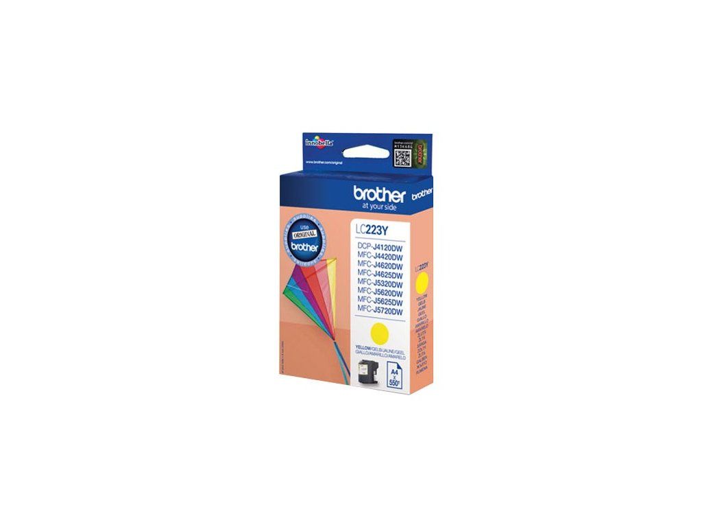 Originální cartridge Brother LC-223Y barva: žlutá výtěžnost: 550 stran stran při 5 % standardním pokrytí Pro tiskárny: Brother CP-J4120DW, MFC-J4420DW, MFC-J4620DW, MFC-J4625DW, MFC-J5320DW, MFC-J5620DW, MFC-J5625DW a MFC-J5720DW