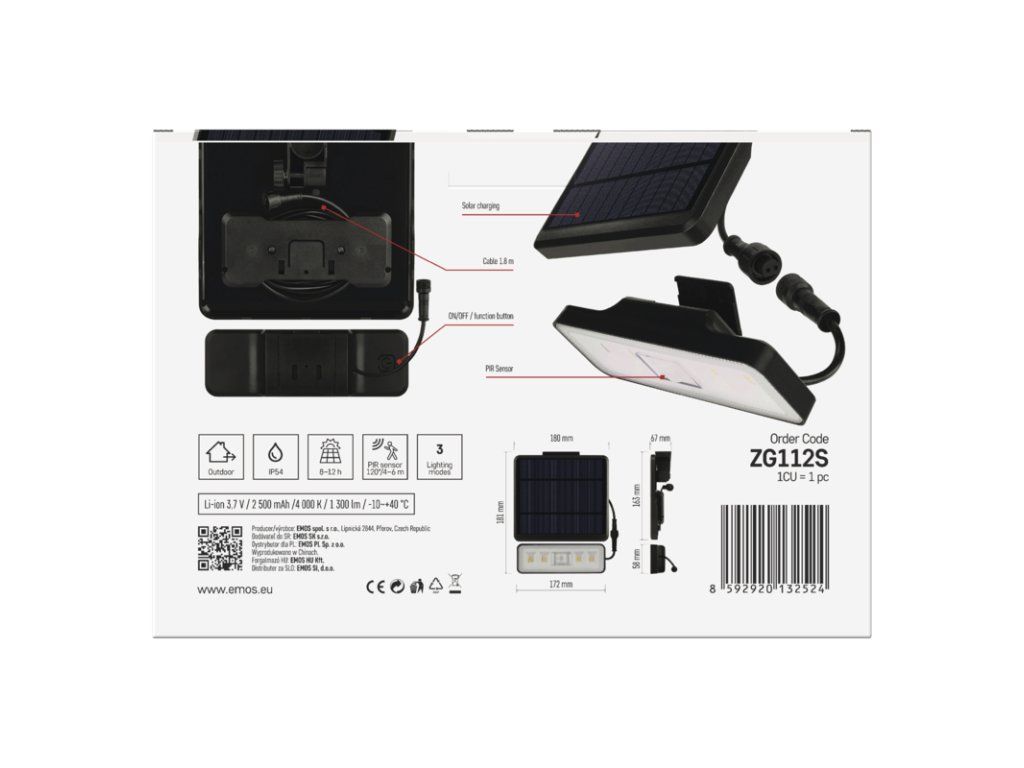 Značka EMOS Objednací číslo ZG112S Produktové číslo 1552112000 EAN 8592920132524 příkon – světelný tok 1 300 lm krytí IP54 PIR senzor ano napájení solární řada neuvádí se použití povrchová montáž zdroj světla LED teplota chromatičnosti 4 000 K kategorie CLASSIC barva světla neutrální bílá index podání barev (CRI) Ra > 80 dosah PIR senzoru 6 m rozsah pracovní teploty -10 °C až +40 °C životnost neuvádí se barva černá napětí 3,7 V délka přívodního kabelu 1,8 m akumulátor Li-Ion 2 500 mAh materiál difuzoru plast (PC) typ přívodního kabelu neuvádí se materiál těla plast (ABS+PC) stmívání neuvádí se doba svícení na AKU neuvádí se flicker-free nebliká frekvence neuvádí se materiál přívodního kabelu neuvádí se počet průchozích zásuvek neuvádí se proud neuvádí se stupeň ochrany proti mechanickým nárazům neuvádí se světelná účinnost neuvádí se typ průchozích zásuvek neuvádí se účiník neuvádí se úhel vyzařování 100° zkušební žárovka součástí balení ne typ stmívání – záruční doba 3 roky rozměr 181 × 180 × 70 mm energetická třída použitého světelného zdroje neuvádí se prodejní obal 1 ks, krabice