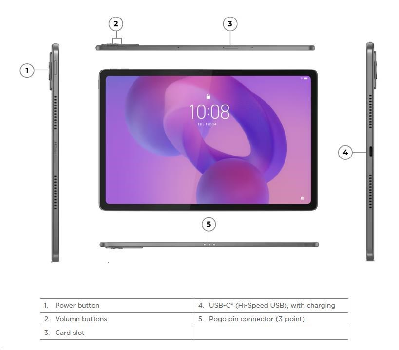 * 1× USB-C® 2.0 (podpora přenosu dat a nabíjení) * 1× slot na microSD kartu * 1× konektor Pogo pin (3bodový)