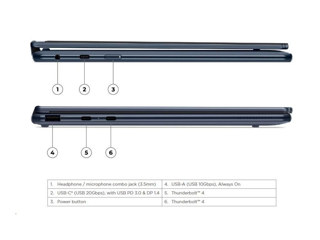 | Standartné porty | 1x USB-A (USB 10Gbps / USB 3.2 Gen 2), Always On 1x USB-C (USB 20Gbps / USB4 Gen 2x2), with USB PD 3.0 and DisplayPort™ 1.4 2x USB-C (Thunderbolt™ 4 / USB4 40Gbps), with USB PD 3.0 and DisplayPort™ 2.1 1x Headphone / microphone combo jack (3.5mm) |