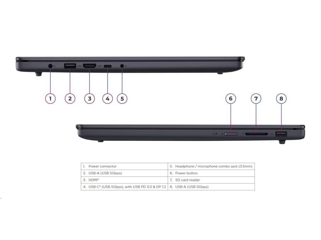 | Standartné porty | 2x USB-A (USB 5Gbps / USB 3.2 Gen 1) 1x USB-C (USB 5Gbps / USB 3.2 Gen 1), with USB PD 3.0 and DisplayPort™ 1.2 1x HDMI 1.4 1x Headphone / microphone combo jack (3.5mm) 1x SD card reader 1x Power connector |