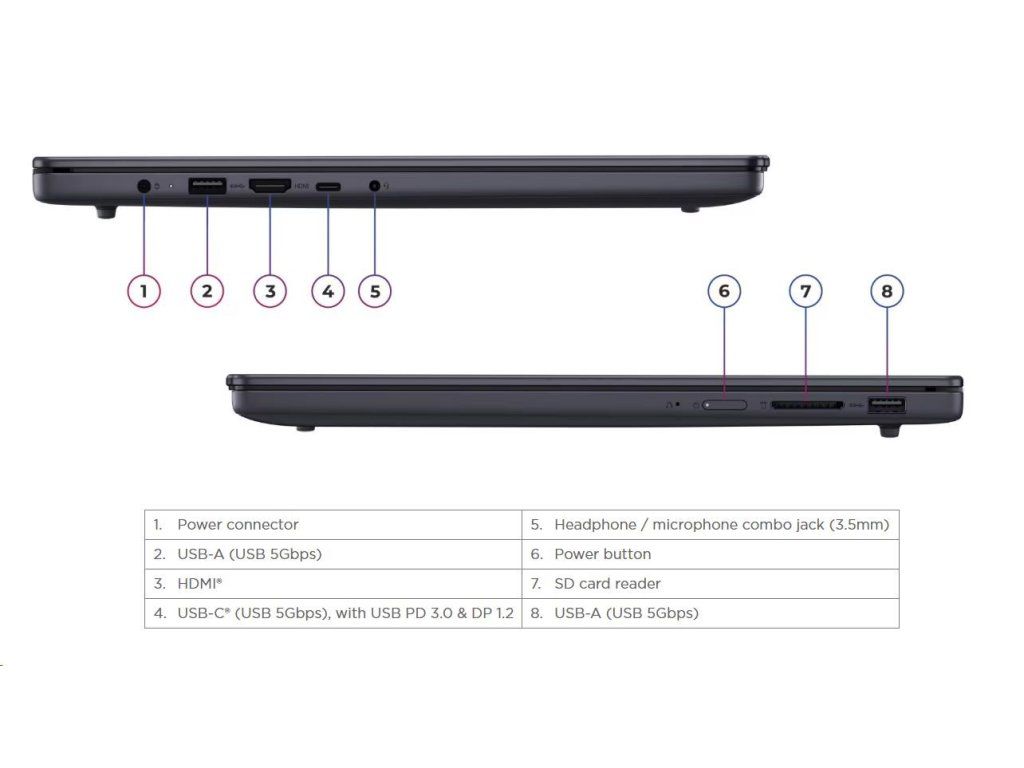 | Standartné porty | 2x USB-A (USB 5Gbps / USB 3.2 Gen 1) 1x USB-C (USB 5Gbps / USB 3.2 Gen 1), with USB PD 3.0 and DisplayPort™ 1.2 1x HDMI 1.4 1x Headphone / microphone combo jack (3.5mm) 1x SD card reader 1x Power connector |