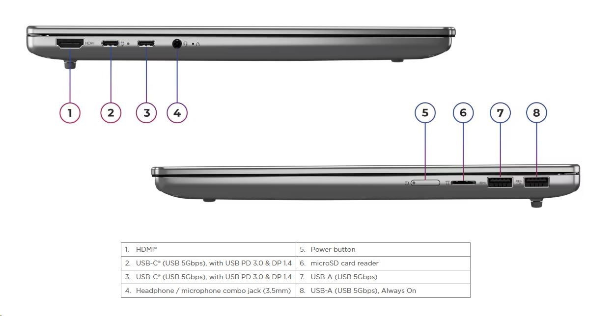 | Standartné porty | 1x USB-A (USB 5Gbps / USB 3.2 Gen 1) 1x USB-A (USB 5Gbps / USB 3.2 Gen 1), Always On 2x USB-C (USB 5Gbps / USB 3.2 Gen 1), with USB PD 3.0 and DisplayPort™ 1.4 1x HDMI 2.1, up to 4K/60Hz 1x Headphone / microphone combo jack (3.5mm) 1x microSD card reader |