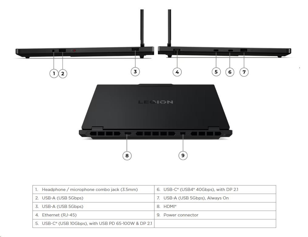 | Standartné porty | 2x USB-A (USB 5Gbps / USB 3.2 Gen 1) 1x USB-A (USB 5Gbps / USB 3.2 Gen 1), Always On 1x USB-C (USB 10Gbps / USB 3.2 Gen 2), with USB PD 65-100W and DisplayPort™ 2.1 1x USB-C (USB4 40Gbps), with DP 2.1 1x HDMI 2.1, up to 8K/60Hz 1x Headphone / microphone combo jack (3.5mm) 1x Ethernet (RJ-45) 1x Power connector |
